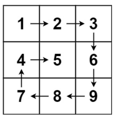 }Up-right direction = 0为下一步向右上方,例如从1到2,此时col++。当direction=0,矩阵为3 * 3,例如从3到7, 此时col = n - 1,则row应该++。若col = n - 1,但此时direction = 1,例如从4到7,此时row++,col--。 Down-left direction = 1与上同理。