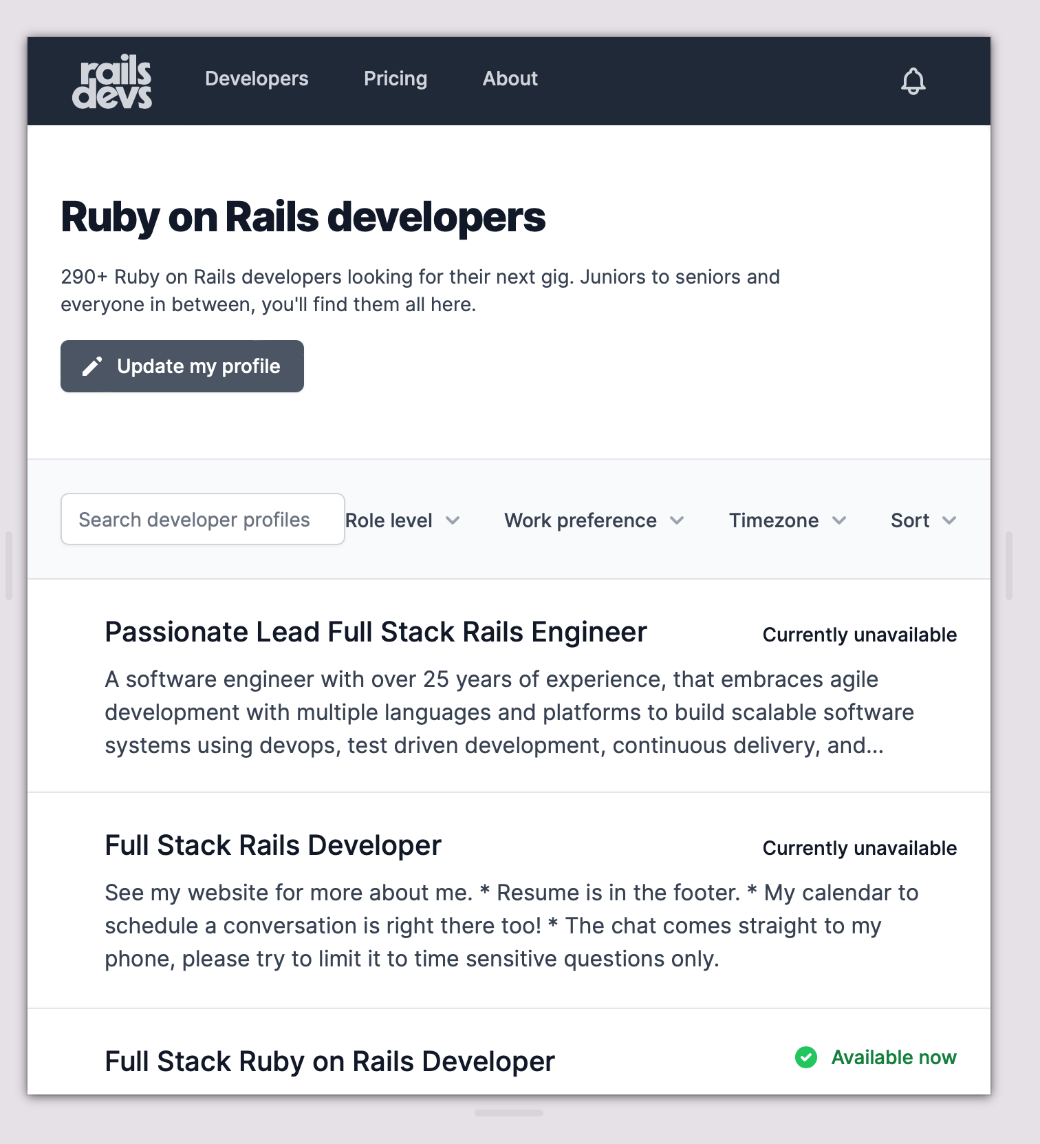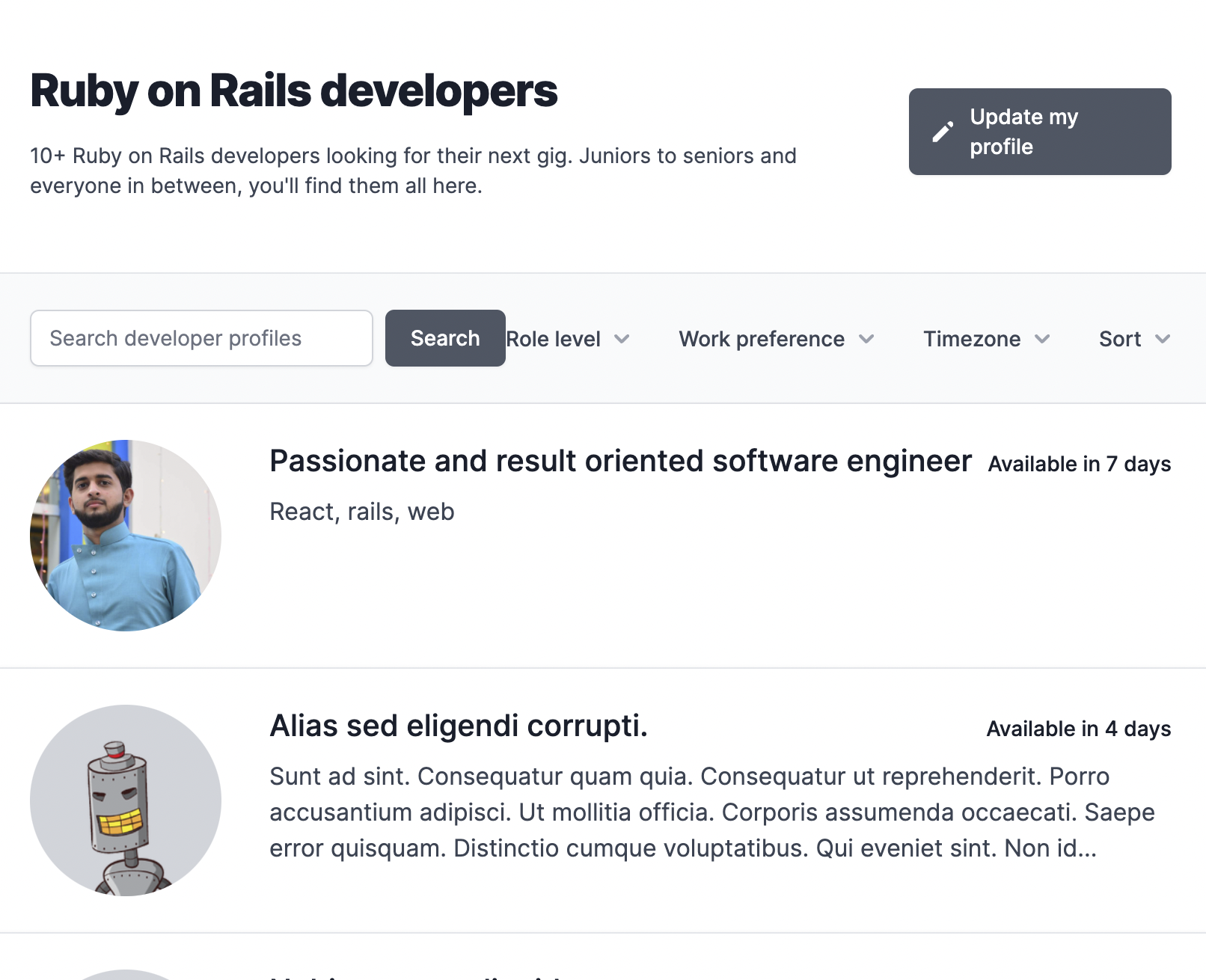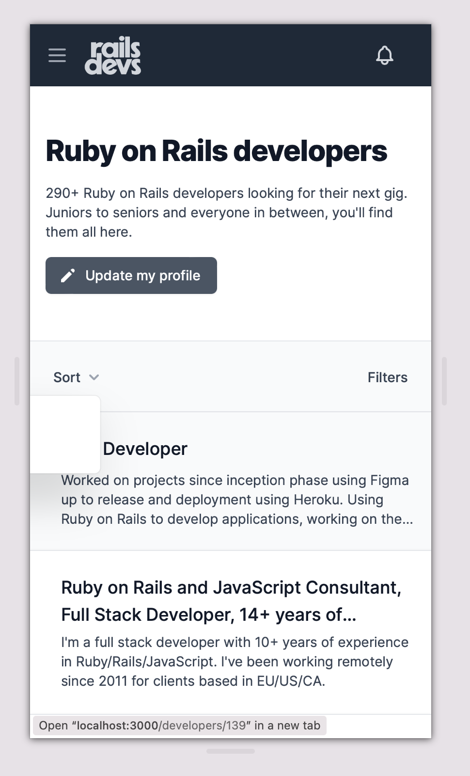 /developerspage to allow users to filter developers by their bio or hero. I have used thepg_searchgem which implements the full text search feature of PostgresSQL usingto_tsvectordata type. Although this approach will work fine now but it will eventually get slow when we have hundreds of developer profiles so we also need to add index for that. I'll be creating a separate issue to add more details regarding its implementation.Pull request checklist