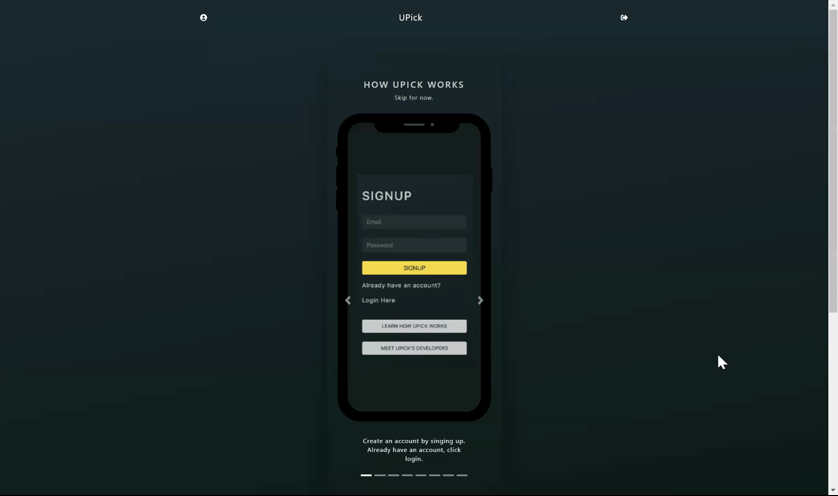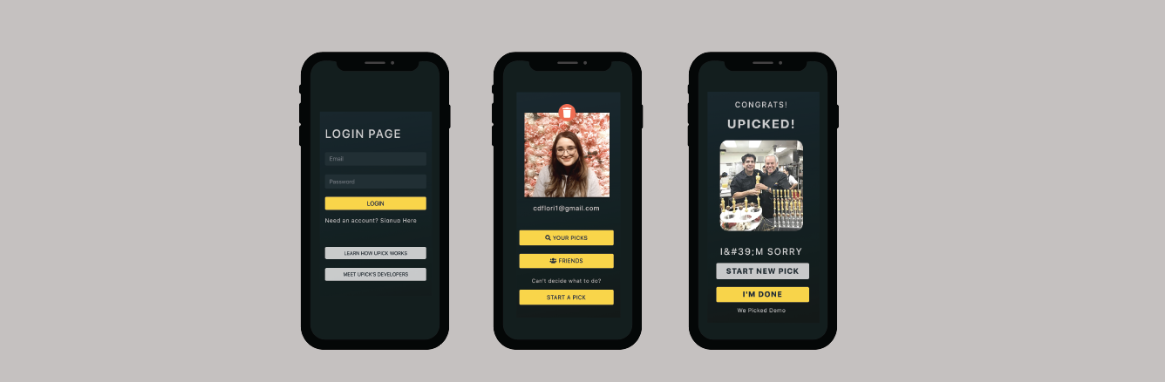 UPick is an app designed to help indecisive users choose entertainment and dining options based on the location of the user. The user may also invite their partner and/or friends. Once the user is signed in, they are sent a verification email, a profile is created and the user can create a 'pick' by inviting friends and choosing entertainment and/or dining.