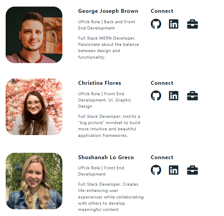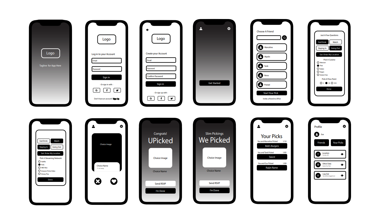 UPick is built using React, React-Bootstrap, and React Router on the Front End. The wireframe shows the steps UI was broken into as the process was visualized. Mobile-first and responsive design were prioritized in development.