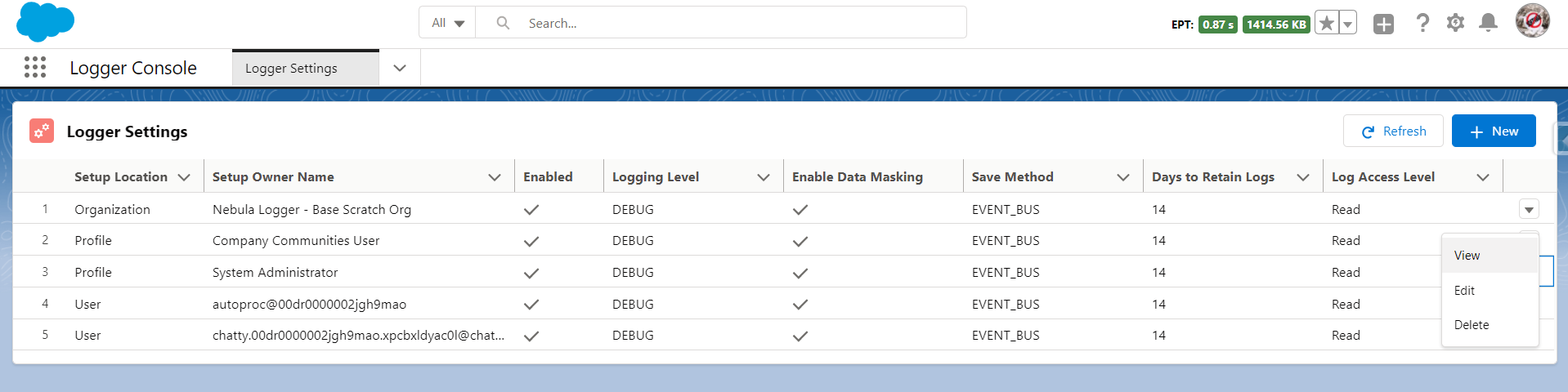 LoggerSettings__crecords - long-term, more optimizations may be needed for orgs that have a lot of records (currently, there is infinite scrolling or pagination)Provides view, create, edit and delete functionality. Anyone with access to the tab/lwc can see the datatable and the 'View' row action - but in order to access/use the 'New' button (create), and the 'Edit' & 'Delete' row actions, users must either have update access on the