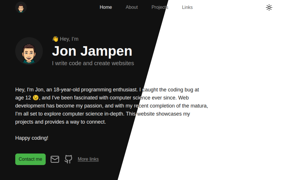 My personal website www.jonjampen.ch is my personal website with links to all of my projects. Stack SvelteKit TailwindCSS lucide.dev (icons) Superforms (form validation) mdsvex (Markdown for project description) Vercel (Hosting + CI/CD)