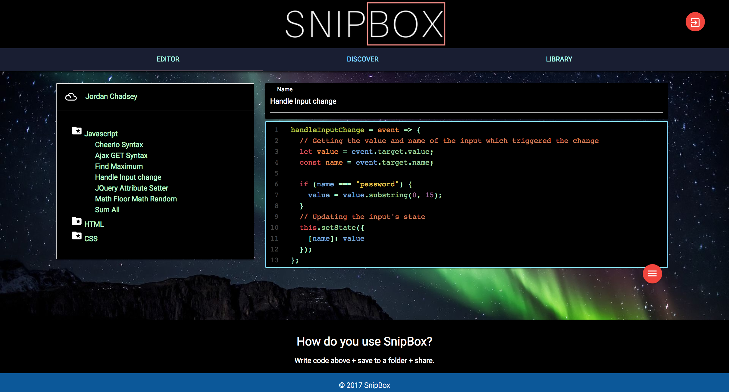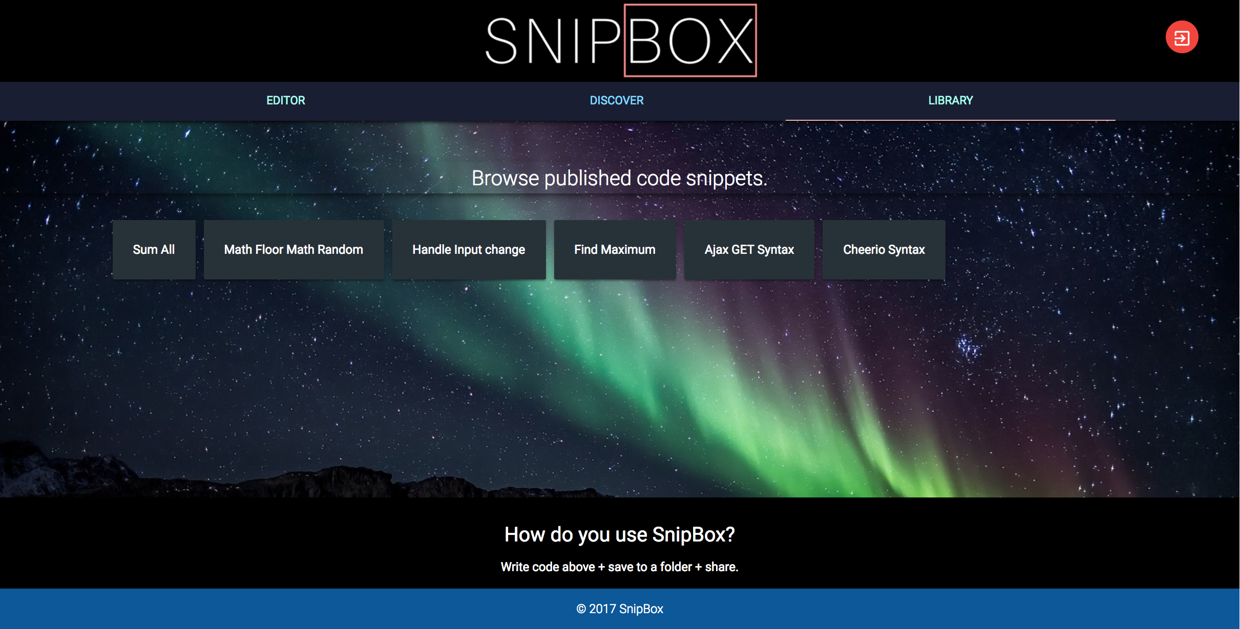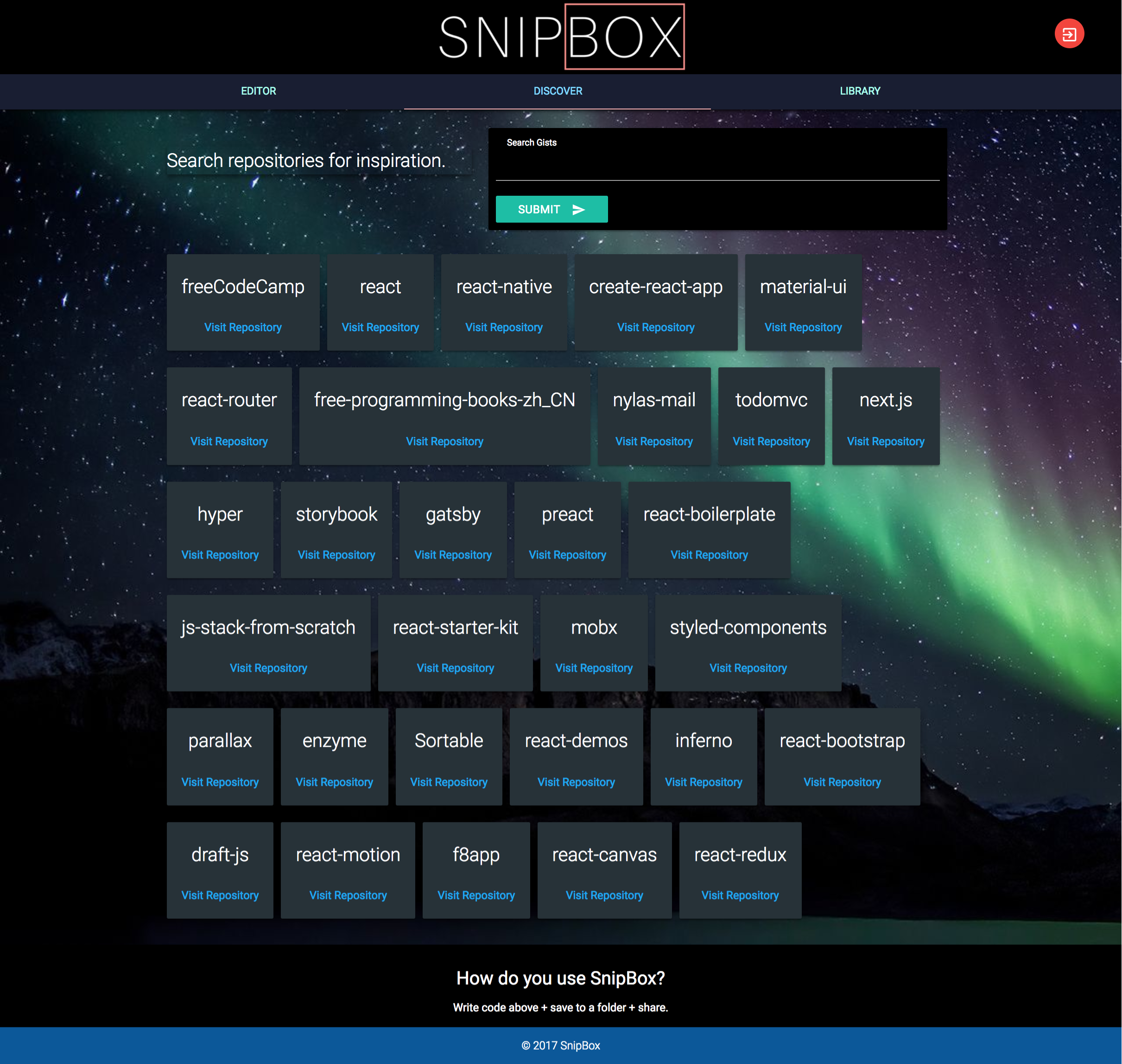 SnipBox is an elegant code snippet solution for developers that allows each user to write, save, copy and share snippets. While each user has his/her own folders (hosted on Firebase with Github authorization), snippets may also be published to or saved from the SnipBox public, user-generated library. Developers may also draw inspiration from Github gists through an integrated search platform.