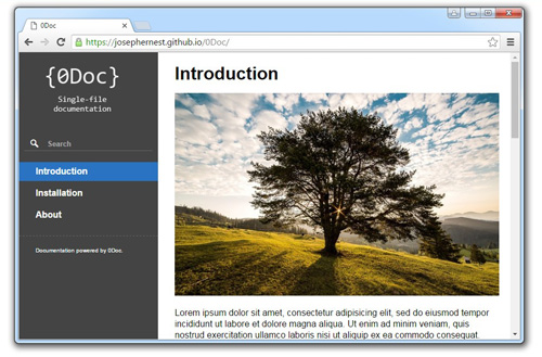 0Doc uses jQuery, marked for Markdown rendering and mark.js for on-page search.