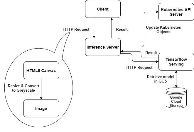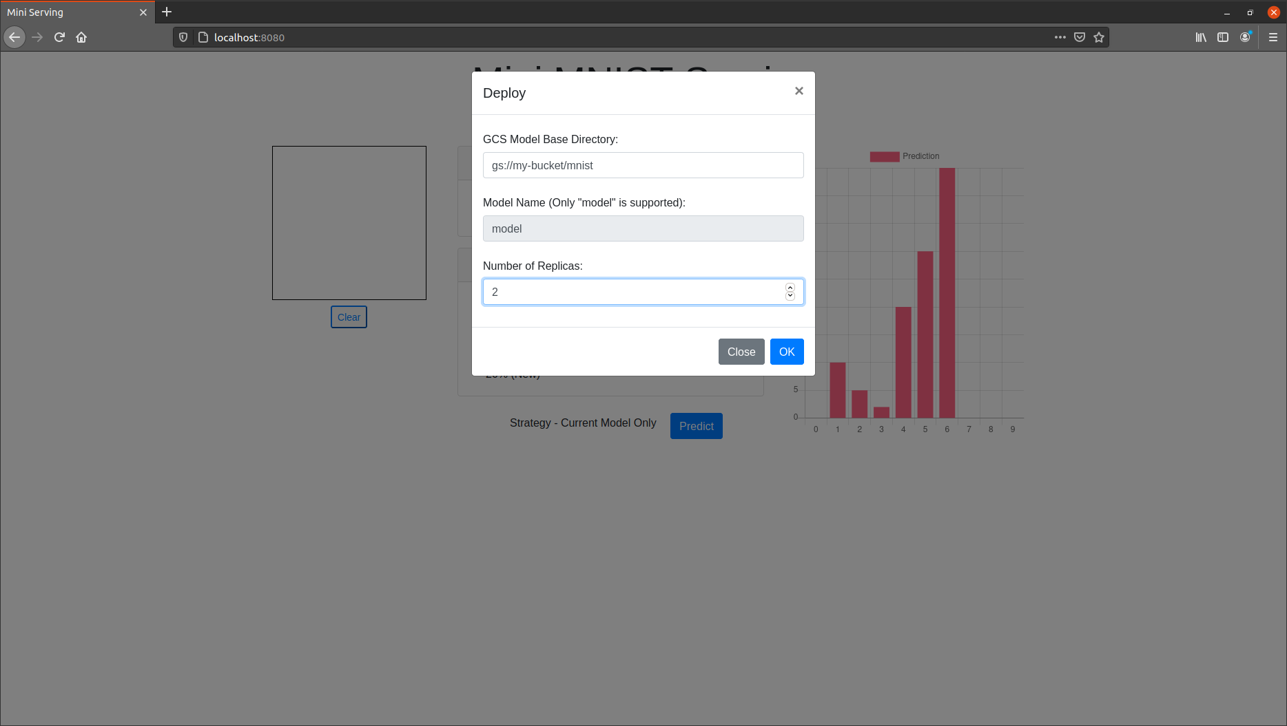 Please set the Tensorflow model directory in your Google Cloud Storage (currently storage services other than GCS are not supported) and number of replicas (number of Pods) in the form. In the example below, the Tensorflow saved model should be located in "gs://my-bucket/mnist/model/1" directory.