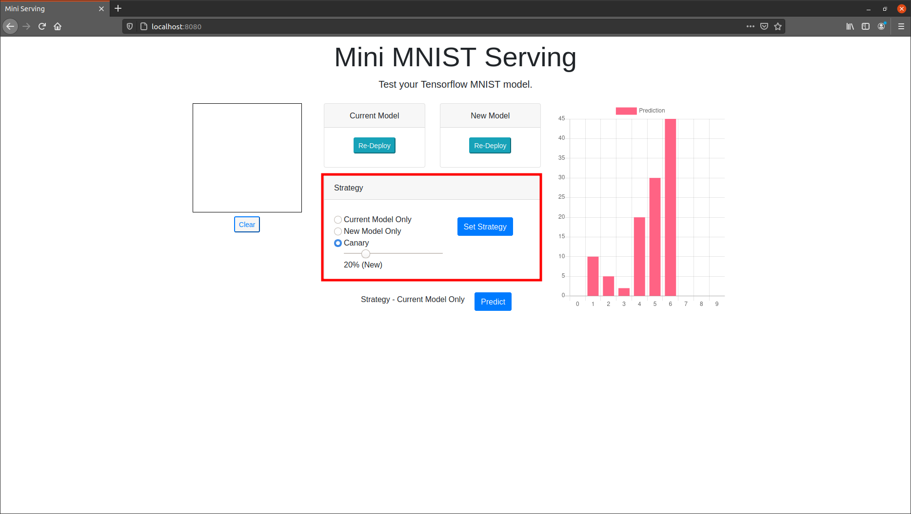 After the models are deployed, you can re-deploy or set strategy (Current model only / New model only / Canary) and predict your hand-written image.