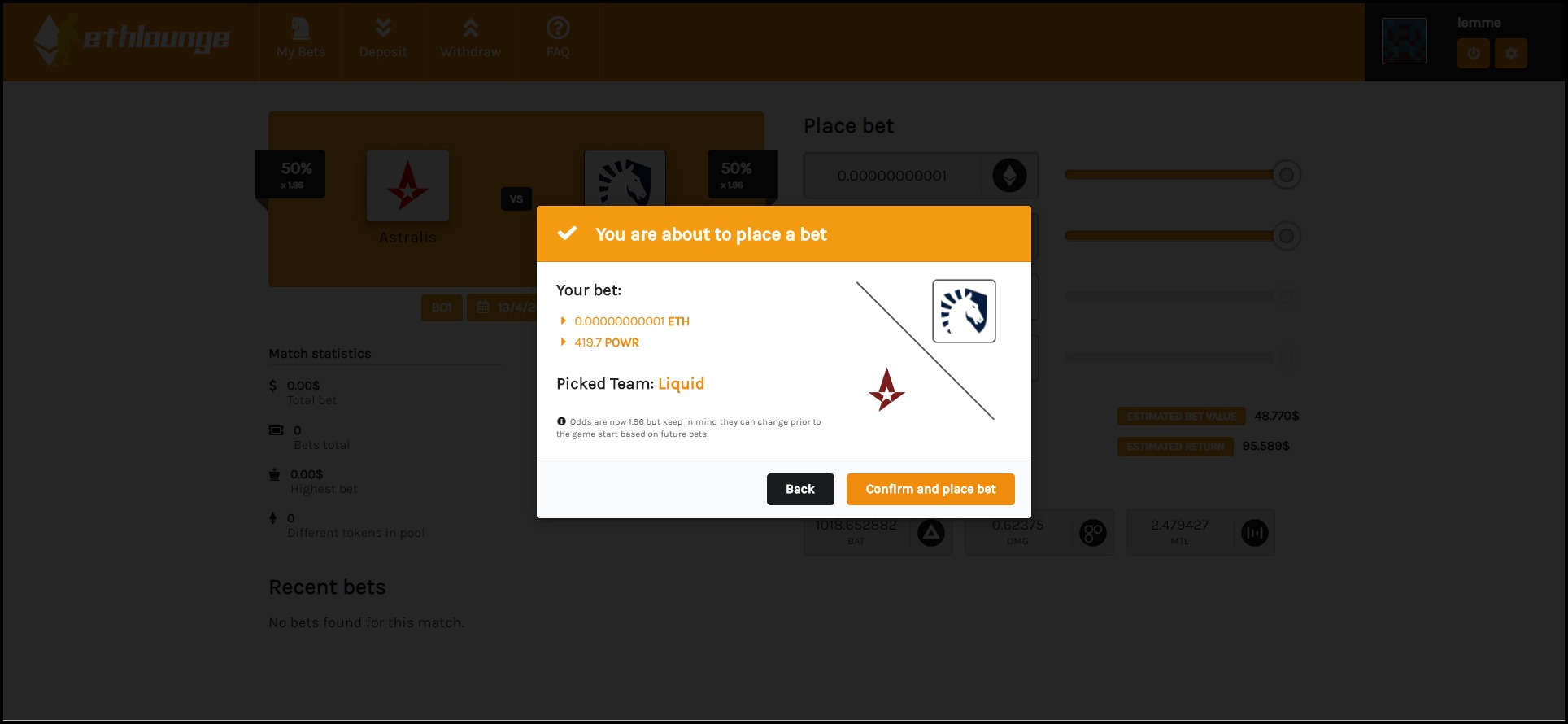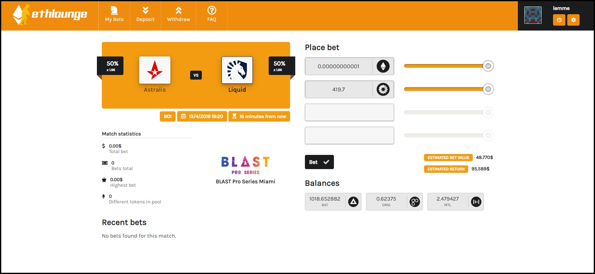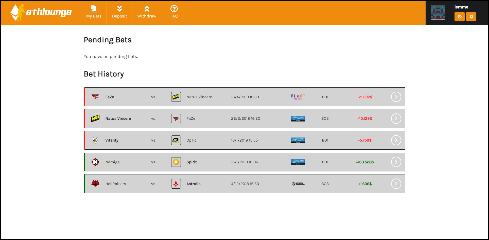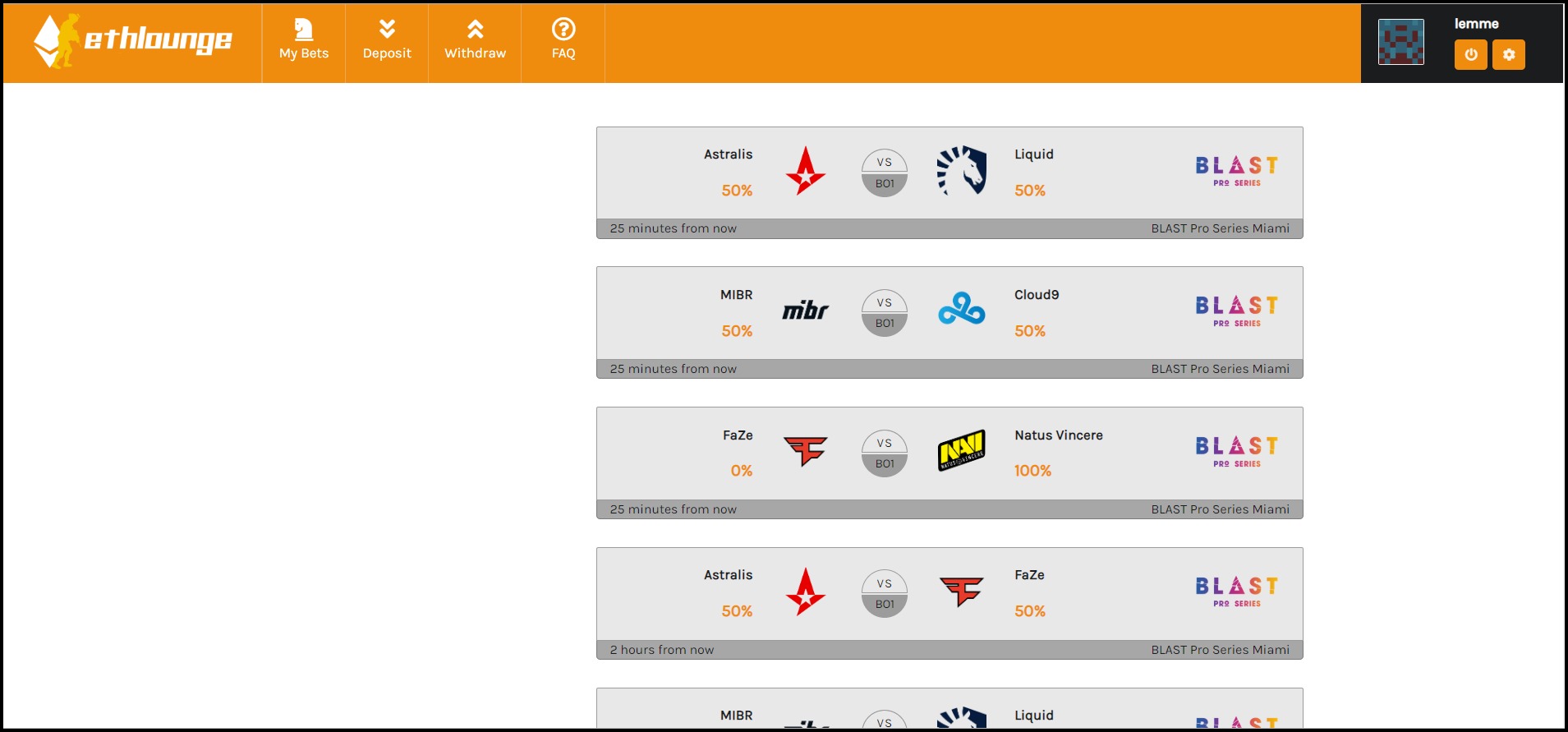 ethlounge is a work in progress user-friendly gambling platform where you can bet on Counter-Strike: Global Offensive e-sport matches with a number of different cryptocurrencies.
