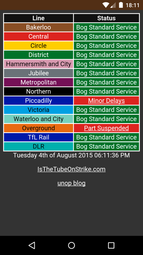 Does it ever bother you when TfL claim to be operating a good service when what they mean is just normal service? I have rectified this with a pragmatic tube status page. You can view it at unop.uk/tube. It's designed with mobile browsers in mind (the page is as small as possible). If the service is anything other than bog standard then it links to the TfL responsive site.