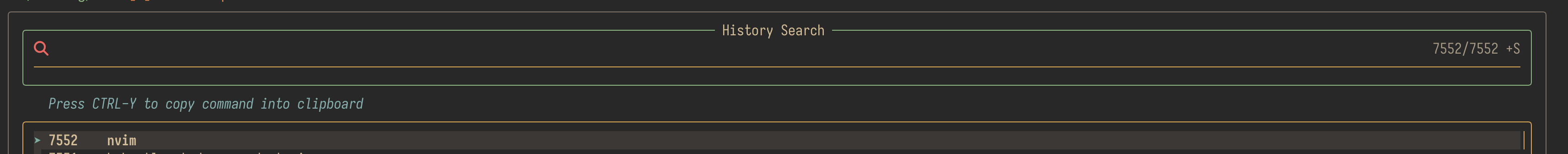 In my "history search", under the magnifying glass, there is this yellow line in the box. I can't figure out where it is coming from and how to disable it: My config looks like this: set -gx FZF_CTRL_R_OPTS '--height=60% --preview "echo {}" --preview-window up:3:hidden:wrap --bind "ctrl-/:toggle-preview" --bind "ctrl-y:execute-silent(echo -n {2..} | pbcopy)+abort" --color header:italic --header "Press CTRL-Y to copy command into clipboard"'
