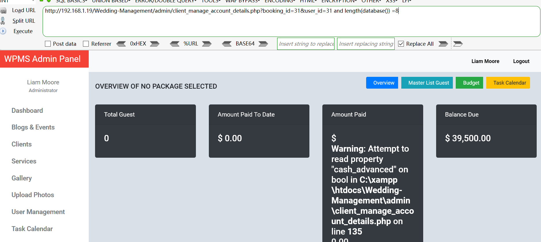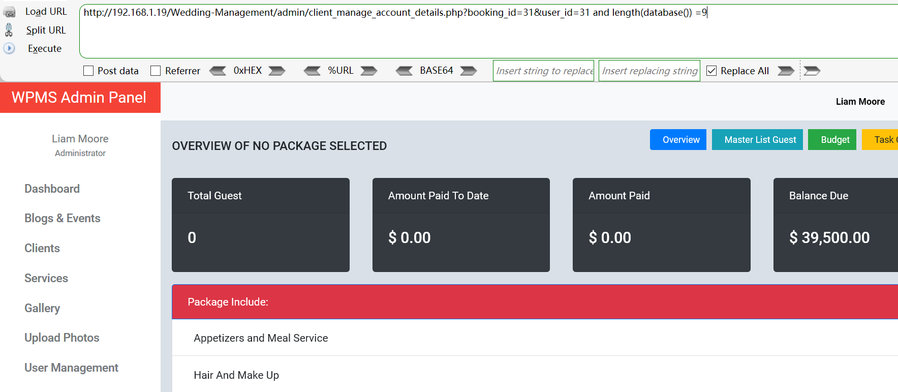 Vulnerability location: /Wedding-Management/admin/client_manage_account_details.php?booking_id=31&user_id=,user_id