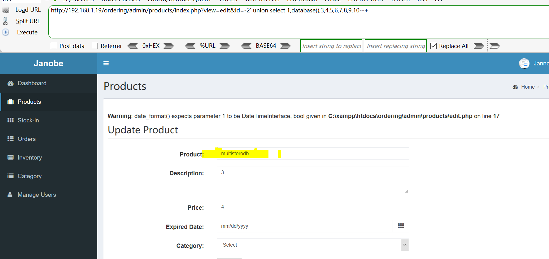 Vulnerability location: /ordering/admin/products/index.php?view=edit&id= //id is Injection point
