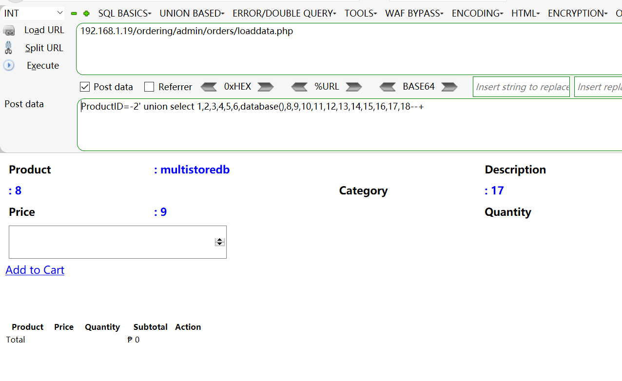 Vulnerability location: /ordering/admin/orders/loaddata.php&ProductID //ProductID is Injection point