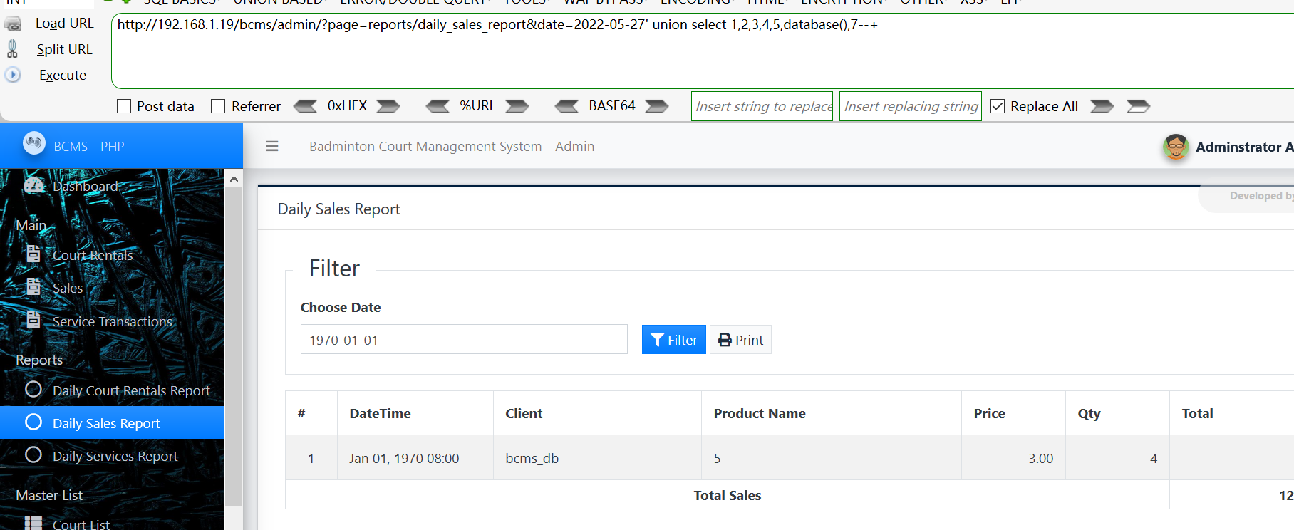 Vulnerability location: /bcms/admin/?page=reports/daily_sales_report&date=, date