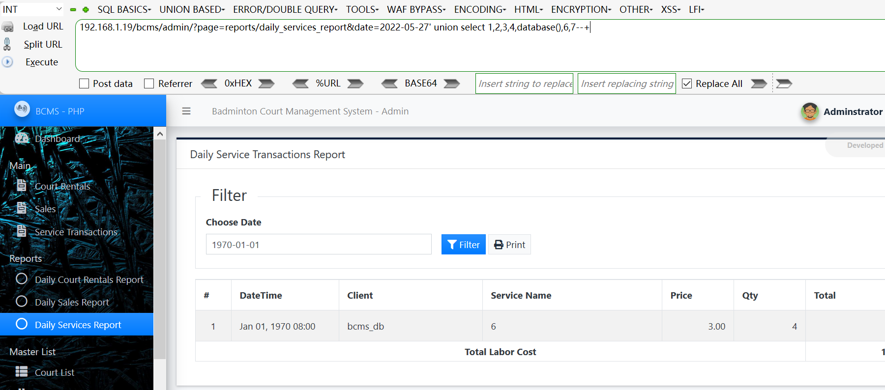 Vulnerability location: /bcms/admin/?page=reports/daily_services_report&date=, date