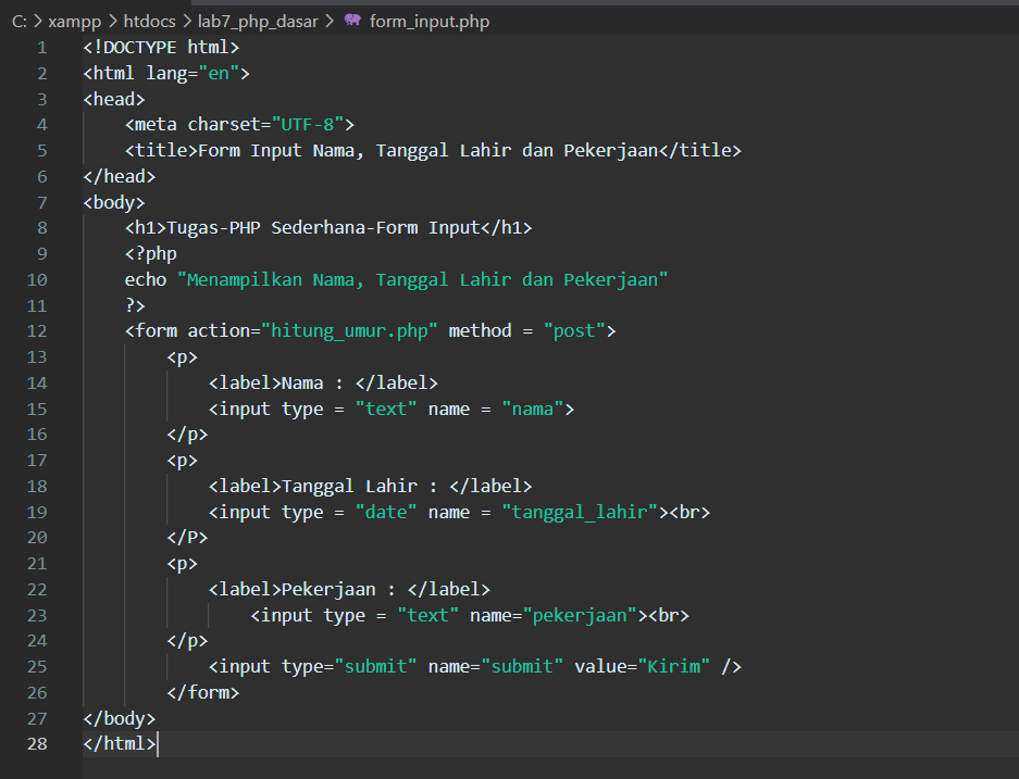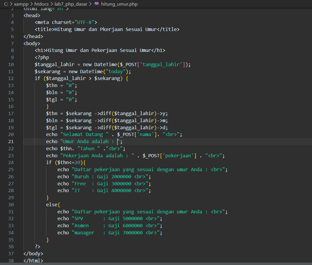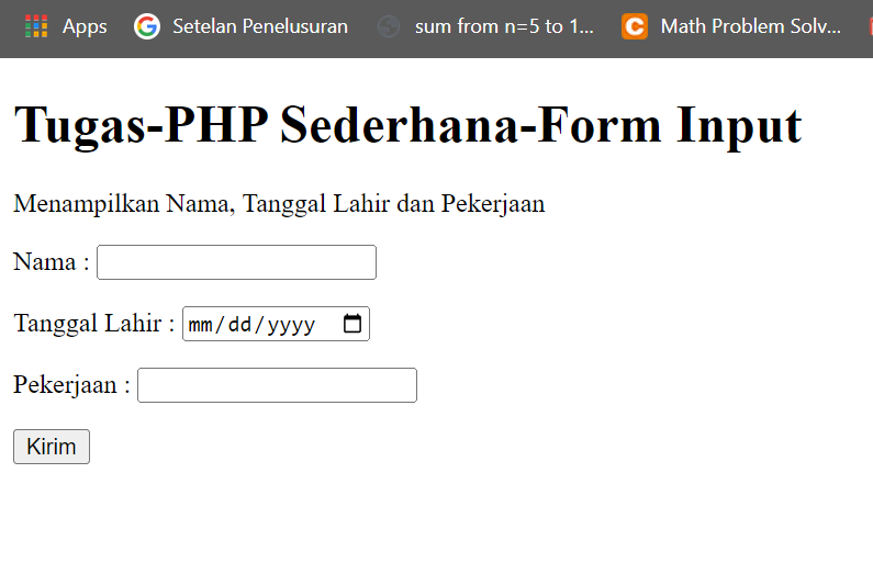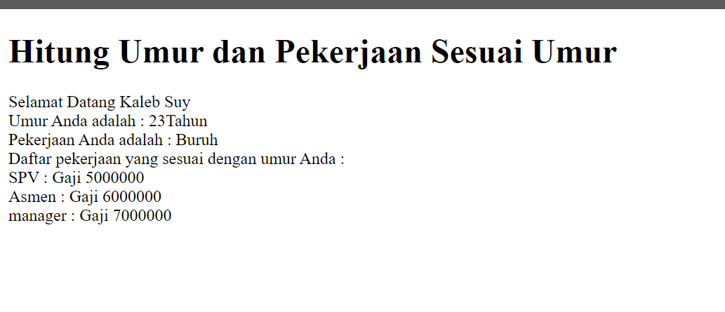 Buatlah program PHP sederhana dengan menggunakan form input yang menampilkan nama, tanggal lahir dan pekerjaan. Kemudian tampilkan outputnya dengan menghitung umur berdasarkan inputan tanggal lahir. Dan pilihan pekerjaan dengan gaji yang berbeda-beda sesuai pilihan pekerjaan.