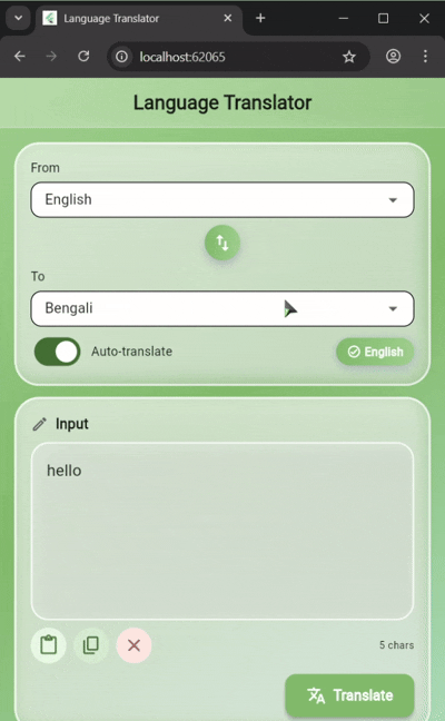 A beautiful, modern language translation app built with Flutter featuring glassmorphism design, voice input, text-to-speech, and translation history.