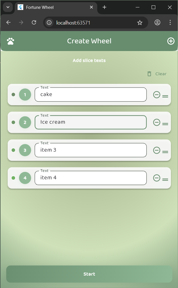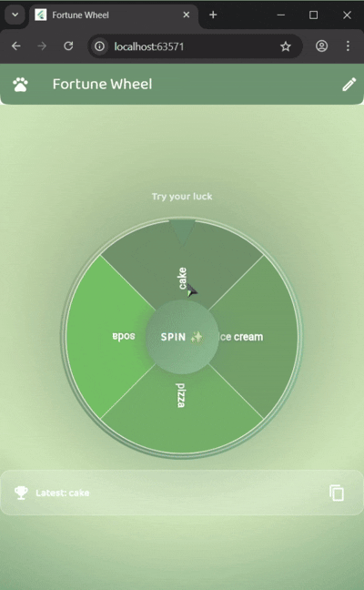 A cute, minimal-yet-polished Flutter fortune wheel with a sage green theme, cute font, glass morphism accents, and a clean “Create Wheel” flow.