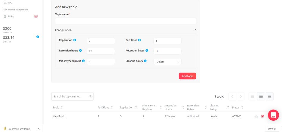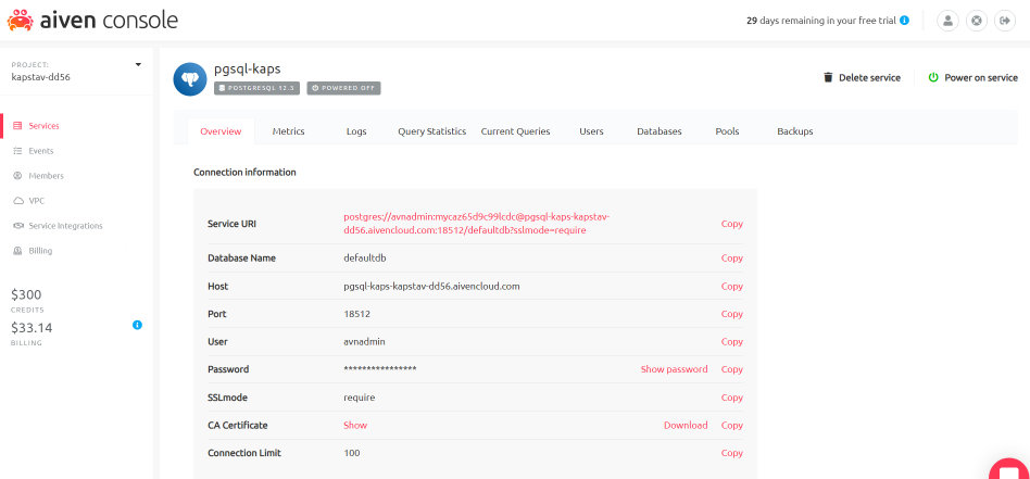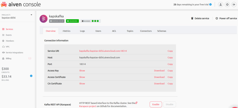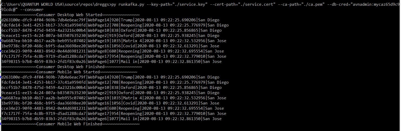 Download service.key, service.cert and ca.pem in local drives from Aiven Console on server (say ./home/) and change the path appropriately. Replace the appropriate URI in the service uri parameter too.Pass postgresql log & password for the URI provided by Aiven Console as colon (:) separated string. py runkafka.py --key-path="./home/service.key" --cert-path="./home/service.cert" --ca-path="./home/ca.pem" --db-cred="avnadmin:xxxxxxxxxc99lcdc@" --consumer