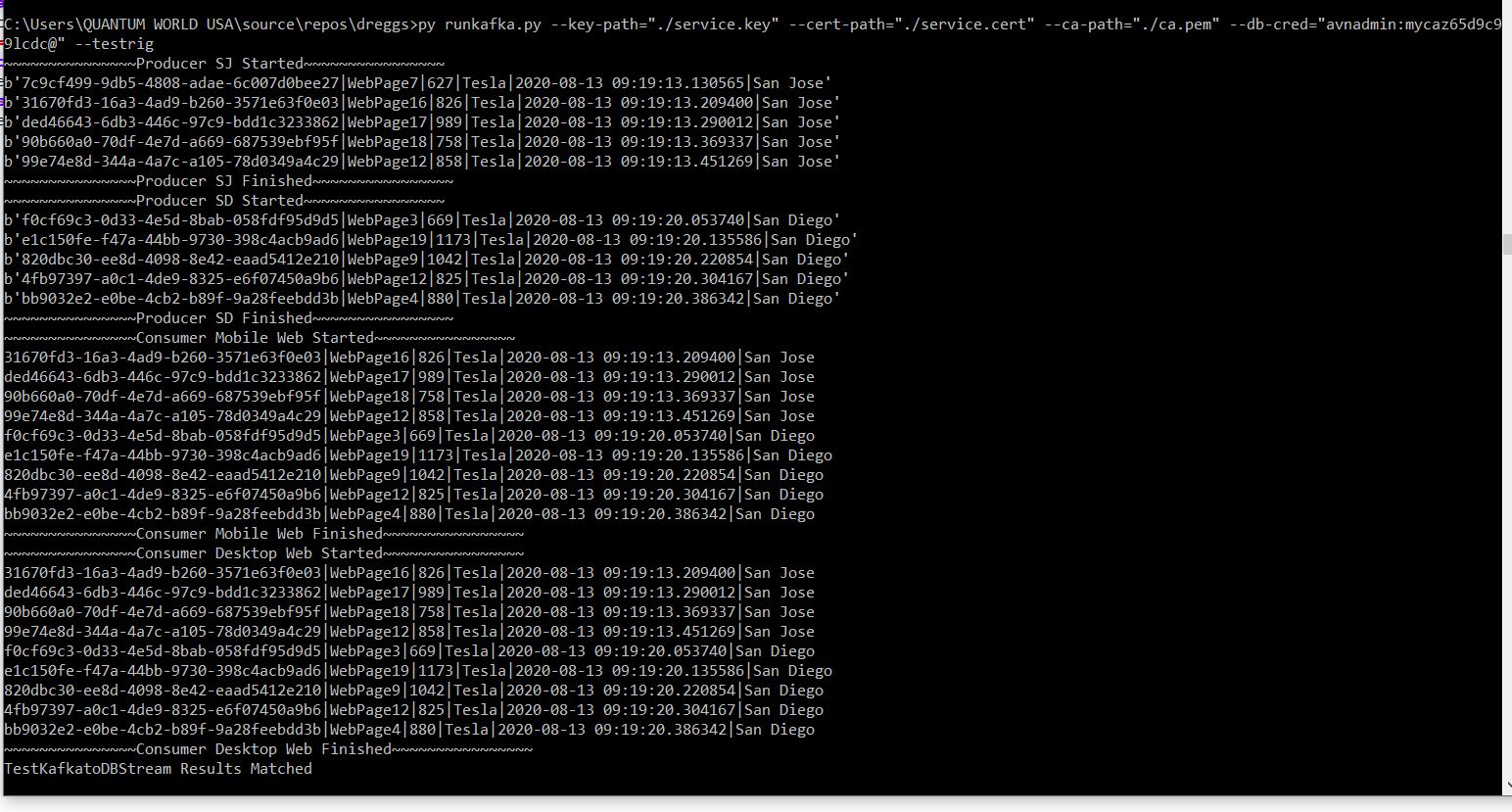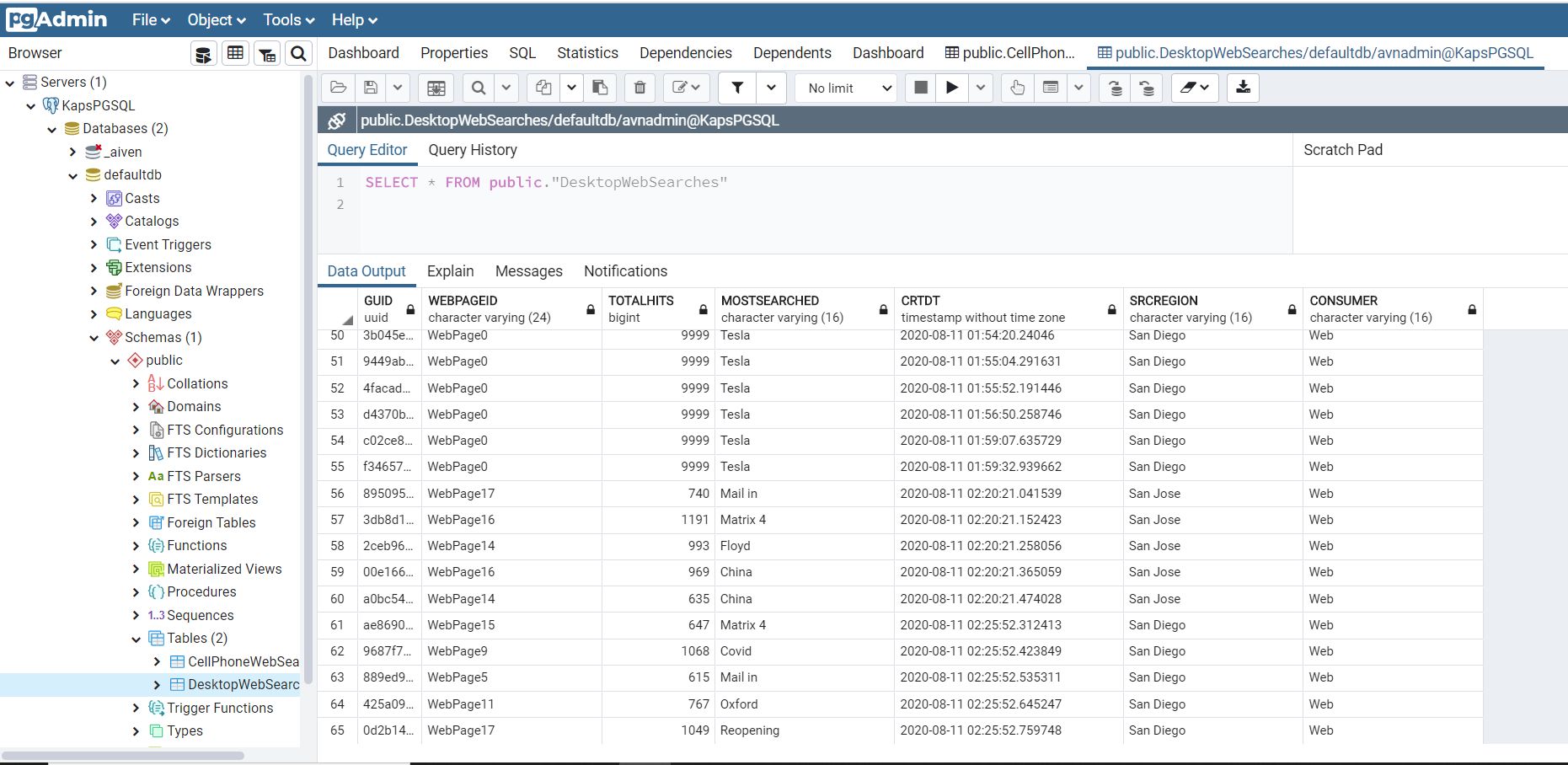 -- Table: public.CellPhoneWebSearchesThe kafka & pgsql endpoints, topic name and sample seed data are set in config.ini. Open it and update appropriately with your subscriptions gotten from Aiven Console. The search strings are single quoted array of some current arbitrary search popular words. Note in testsearch there just one word allowed for now (Tesla). These words can be changed to anything in config.ini. These are randomly selected. py runkafka.py --key-path="./home/service.key" --cert-path="./home/service.cert" --ca-path="./home/ca.pem" --db-cred="avnadmin:xxxxxxxxc99lcdc@" --producer-- DROP TABLE public."CellPhoneWebSearches";